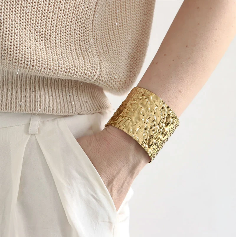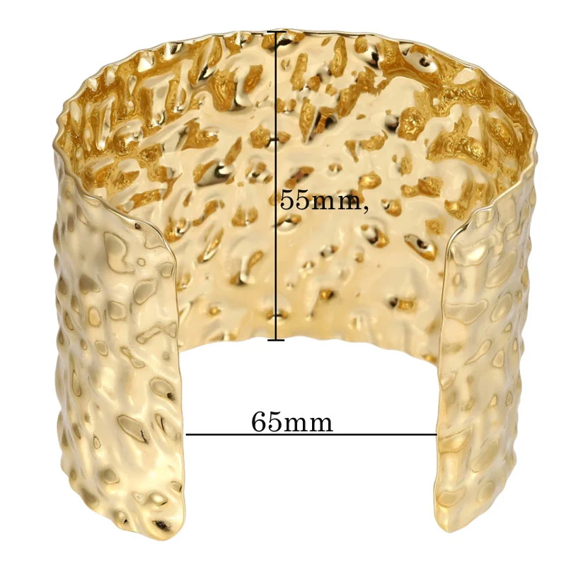 Pevný náramek z chirurgické oceli s povrchem pozlaceným 14k žlutým zlatem. Vnitřní šíře náramku 65mm, šířka náramku 55mm. Rozměry najdete zobrazené na podpůrné fotografii.