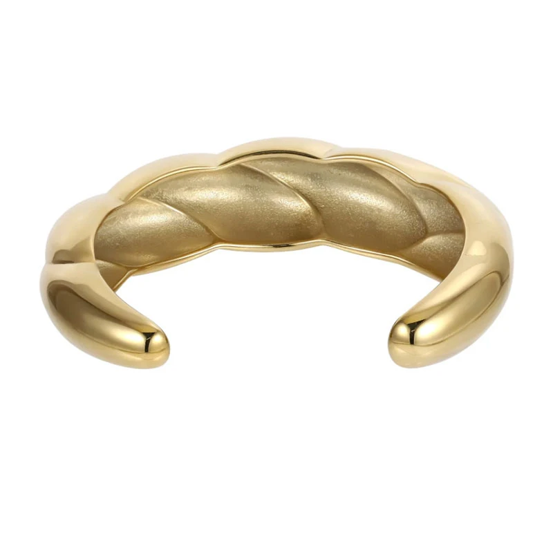 Pevný náramek z chirurgické oceli s povrchem pozlaceným 14k žlutým zlatem. Vnitřní šíře náramku 60mm, šířka náramku 20mm, výška 13mm. Rozměry najdete zobrazené na podpůrné fotografii.