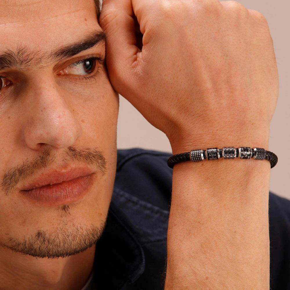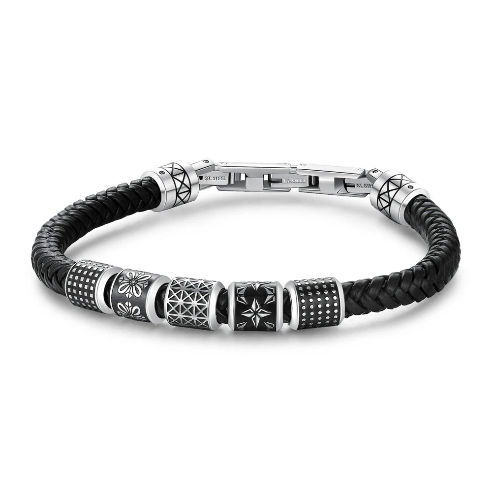 Pánský náramek na ruku z chirurgické oceli. Ocelové prvky jsou zdobené černým smaltováním. Délka náramku 21 cm, zapínání náramku je karabinové.