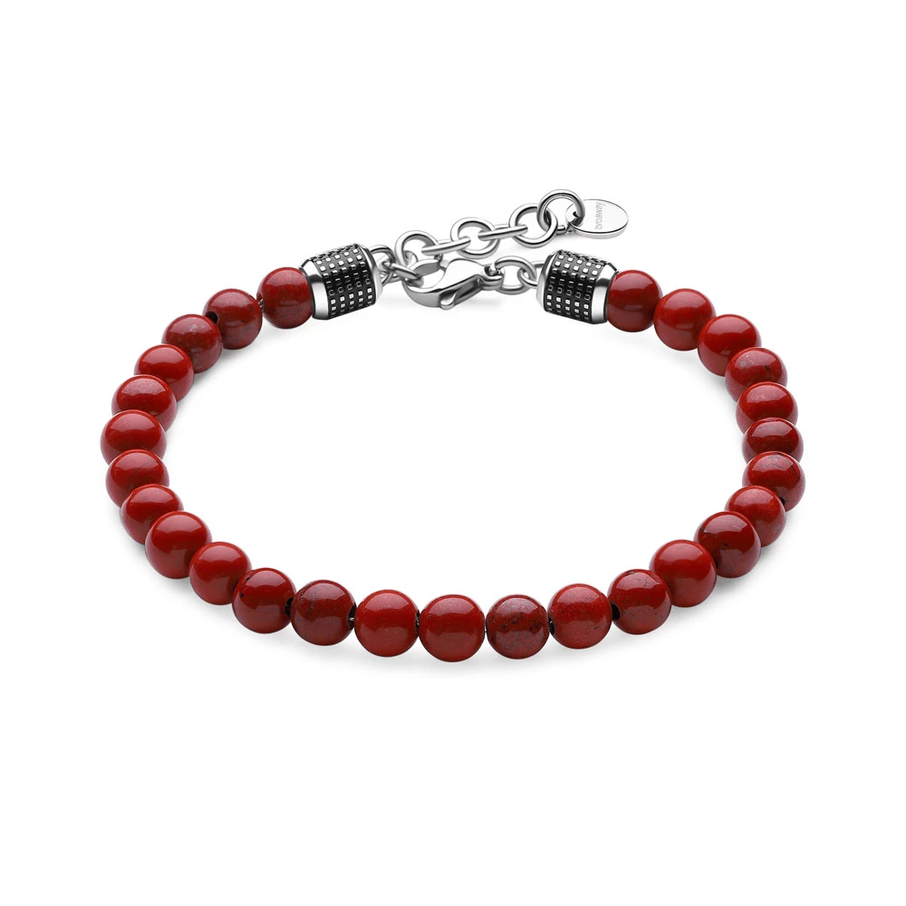 Náramek na ruku z chirurgické oceli s Jaspisovými korálky. Zapínání náramku je karabinové, délka 21cm.