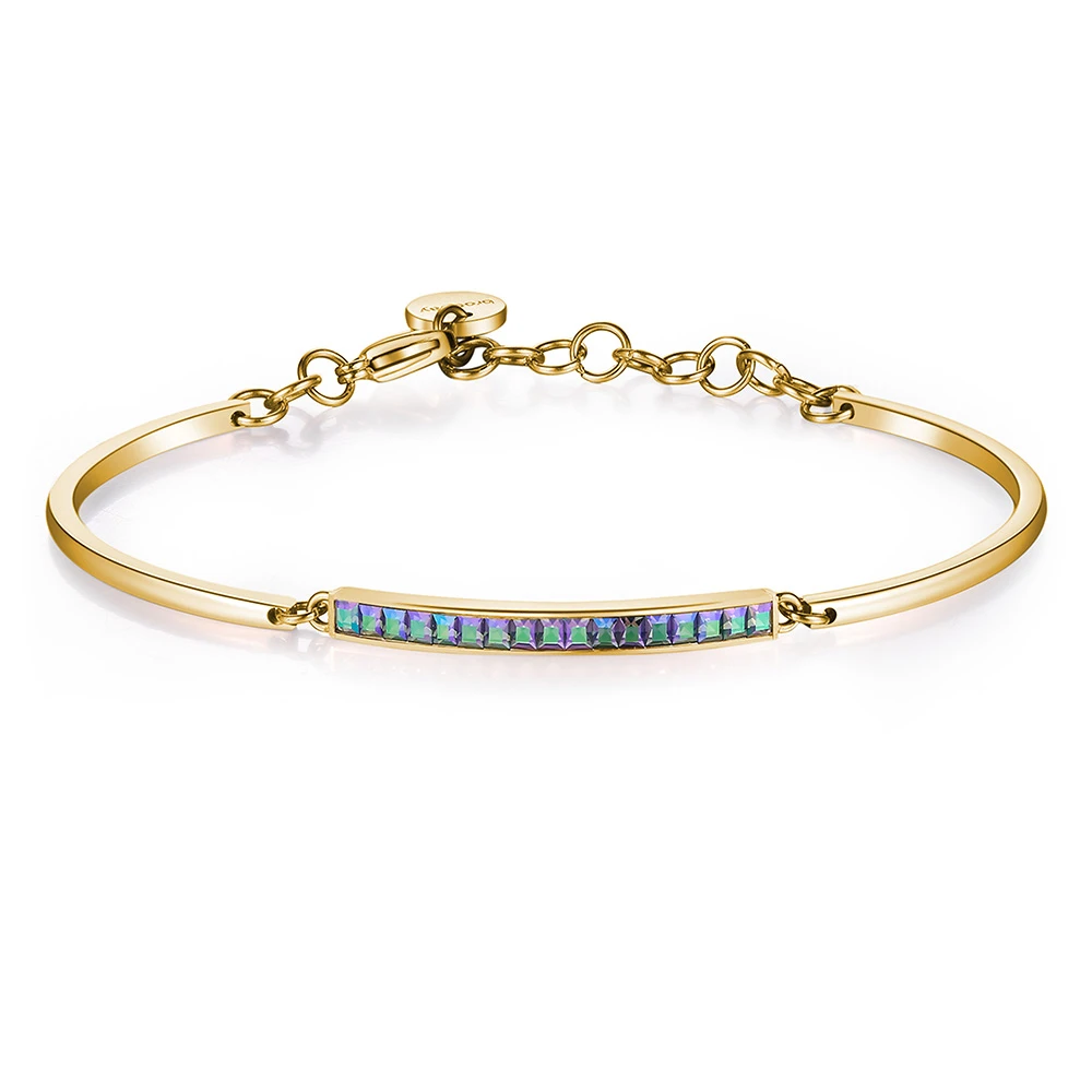 Náramek Brosway z kolekce CHAKRA s křišťálovým rajským leskem Swarovski pozlacený technologií PVD je vyrobený z chirurgické oceli 316L. Šperky vyrobené z chirurgické oceli jsou odolné proti poškrábání, nemění barvu, neoxidují, nevyvolávají alergické reakce ani nereagují na pot a prach. Zapínání náramku je na karabinku. Průměr náramku je 65 mm.