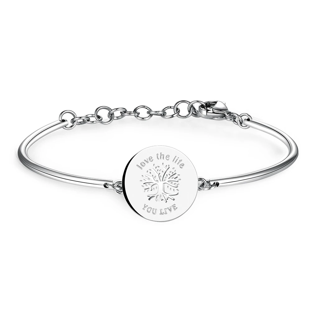 Náramek Brosway z kolekce CHAKRA zdobený přívěskem s rytinou "love the life YOU LIVE" a stromem života je vyrobený z chirurgické oceli 316L. Šperky vyrobené z chirurgické oceli jsou odolné proti poškrábání, nemění barvu, neoxidují, nevyvolávají alergické reakce ani nereagují na pot a prach. Zapínání náramku je na karabinku. Průměr náramku je 65 mm.
