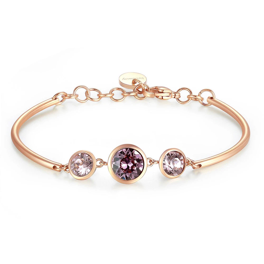 Dámský náramek z chirurgické oceli 316L. Krásný náramek zdobený třemi krystaly v různých odstínech růžové barvy. Leštěný povrch náramku je pozlacený technologií PVD. Vnitřní průměr náramku 65mm.