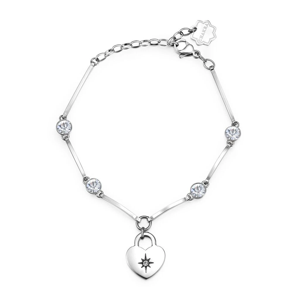 Náramek z chirurgické oceli z kolekce Chakra s ozdobou srdíčka. Povrch náramku je leštěný. Náramek zdobí zářivé krystaly. Délka 18,5cm. Zapínání náramku je karabinové.