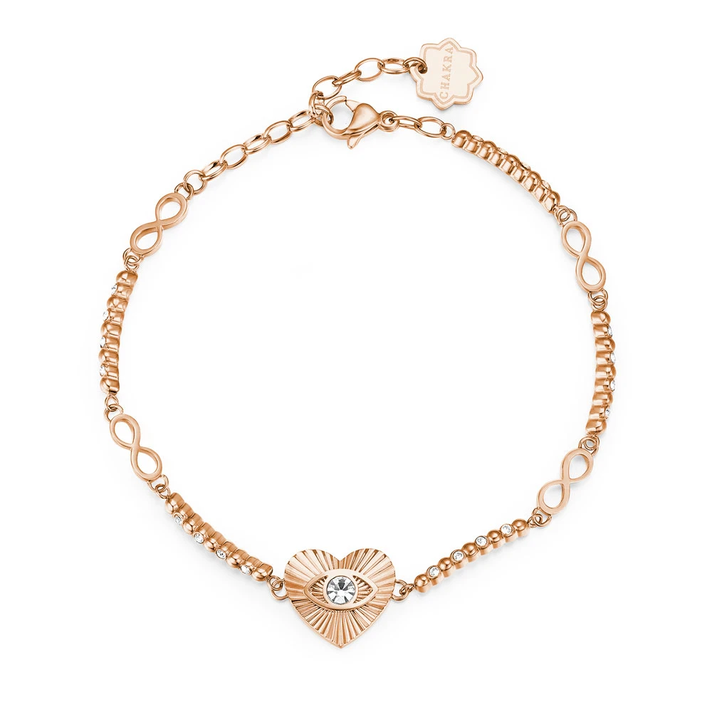 Náramek na ruku z chirurgické oceli. Náramek je ozdobený přívěskem srdíčka se zirkonem a symboly nekonečna. Povrch náramku je pozlacený technologií PVD. Náramek má zapínání na karabinu. Délka náramku 18,5 cm.