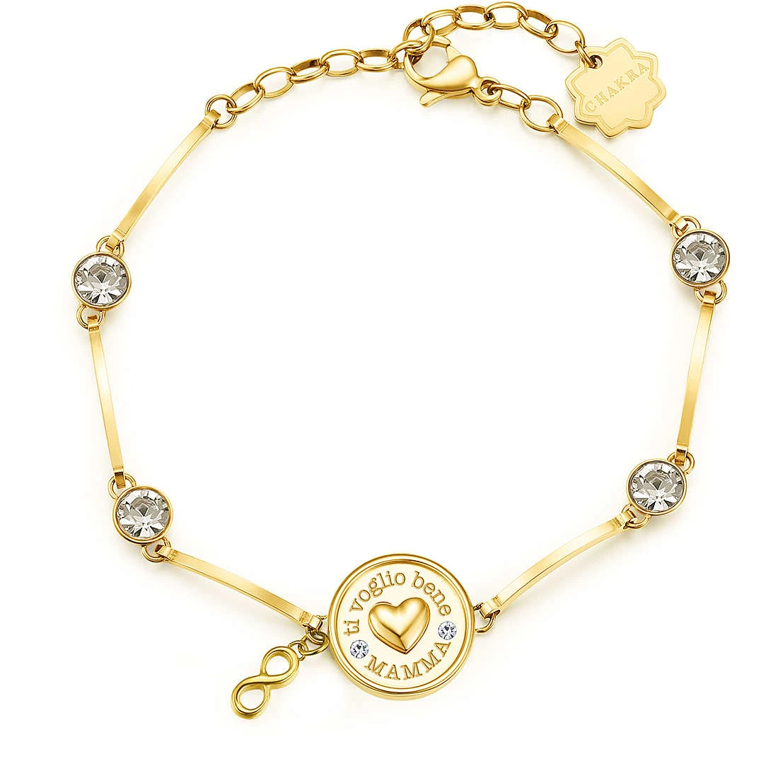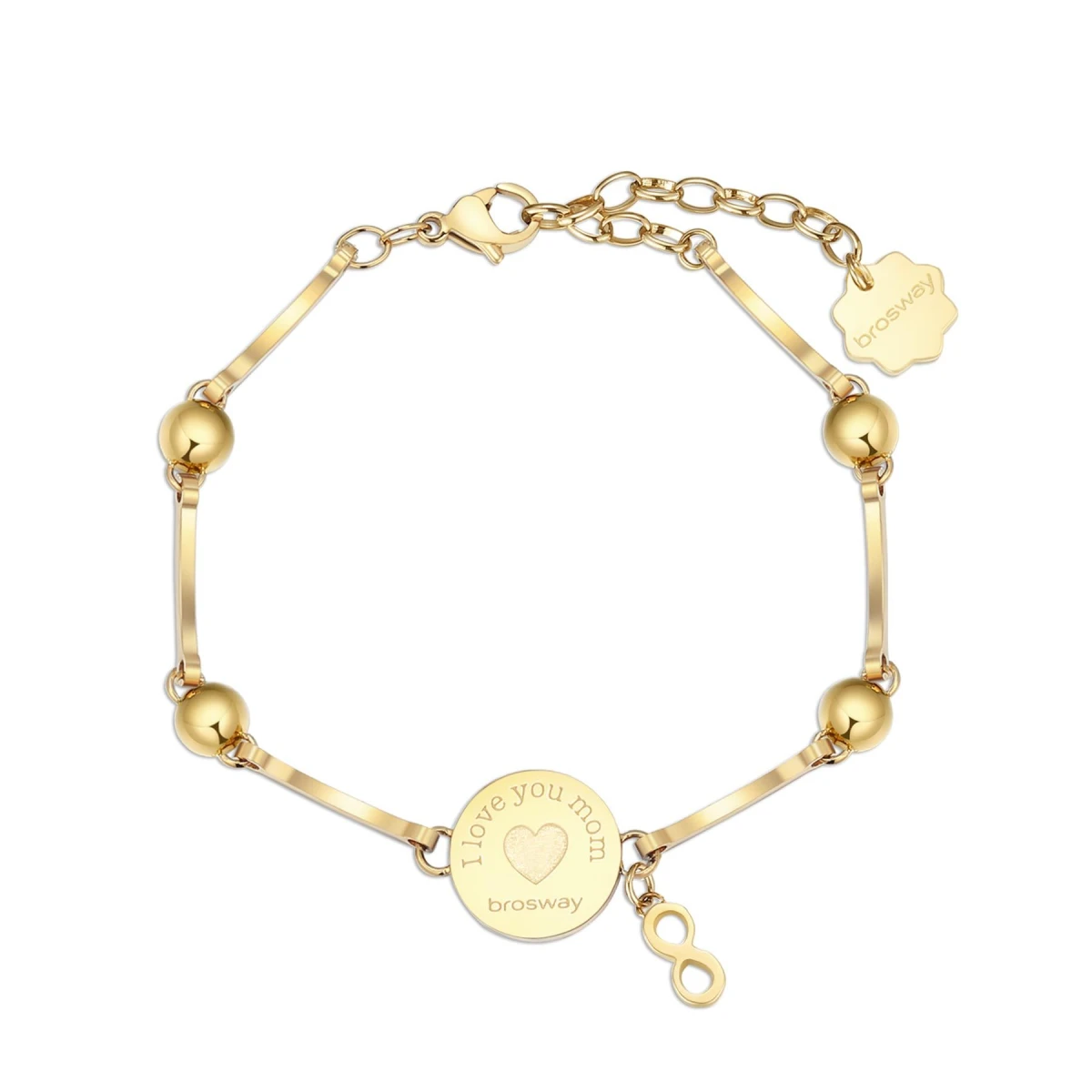 Dámský náramek z chirurgické oceli 316L pro maminky. Povrch náramku je pozlacený technologií PVD. Ozdoba náramku se srdíčkem nese rytinu I Iove you mom. Náramek je ozdobený zářivými kamínky. Délka náramku 18cm.