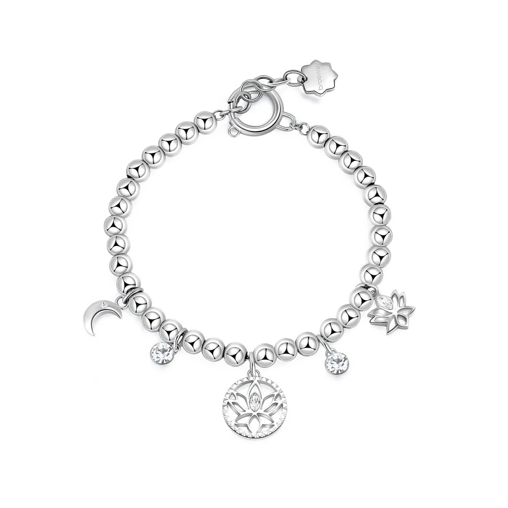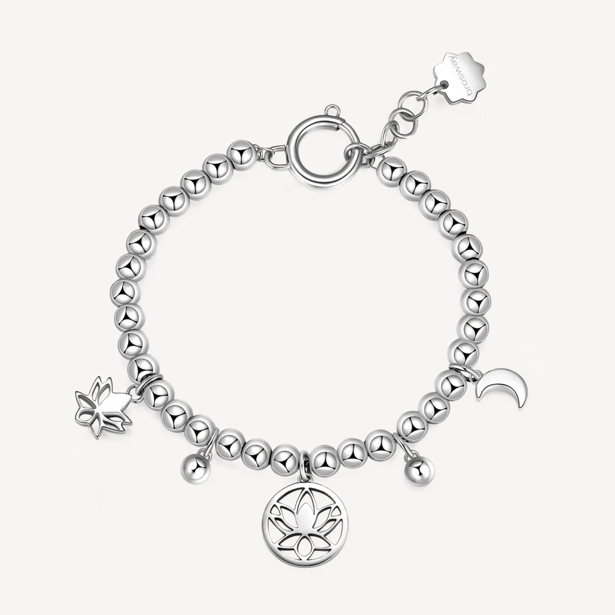 Dámský náramek z chirurgické oceli 316L s přívěsky. Povrch náramku je leštěný. Přívěsky jsou osazené zářivými krystaly. Některé přívěsky mají tvar lotosového květu. Délka náramku 18,5cm.