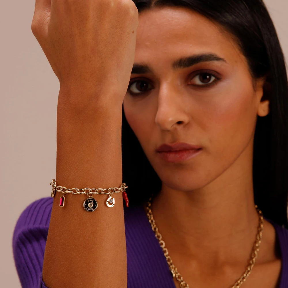 Náramek na ruku z kolekce Brosway Chakra je zdobený přívěšky a kamínky. Krásný dámský náramek je vyrobený z chirurgické oceli 316L a pozlacený technologií PVD. Zapínání je na karabinu a délka náramku je 18,5 cm.
