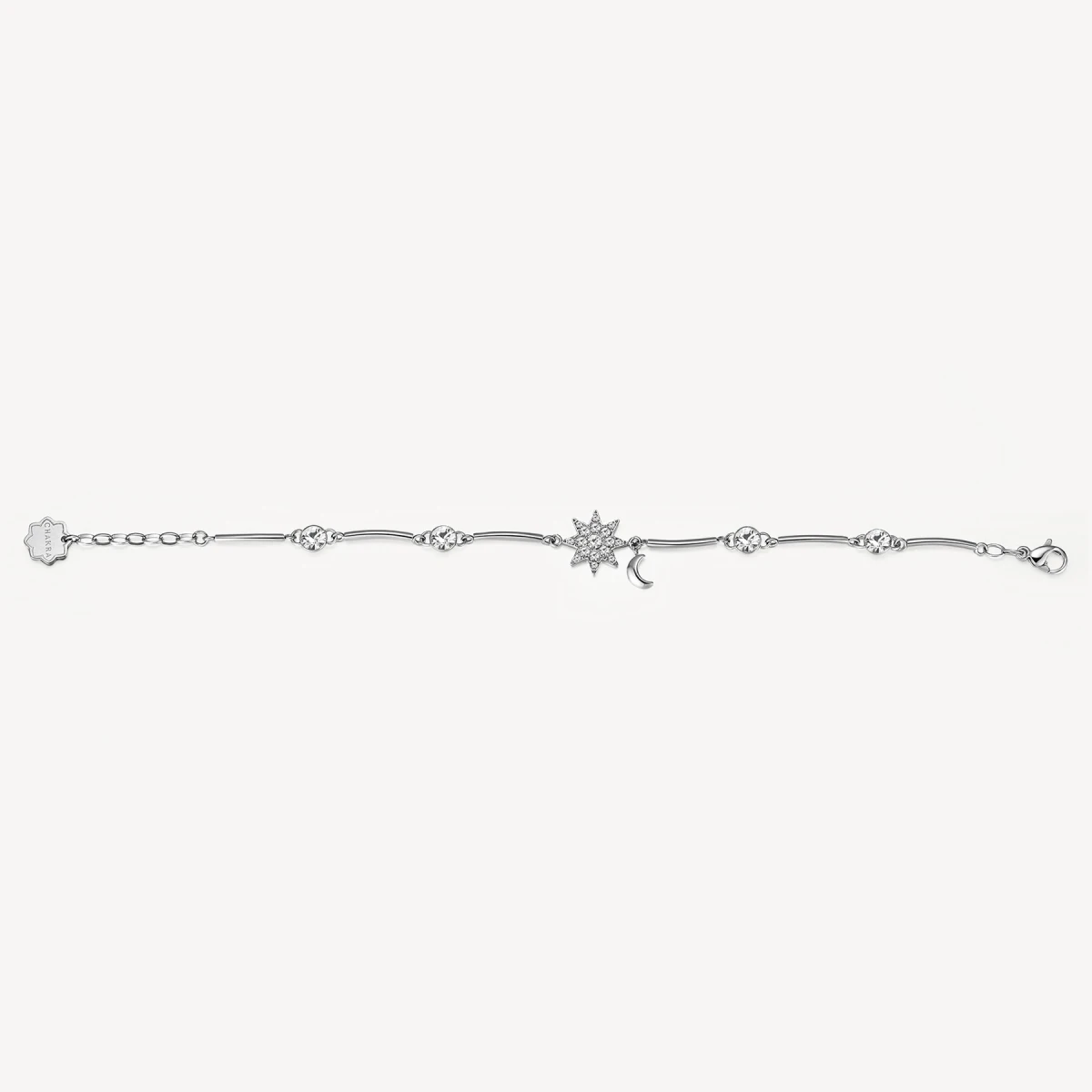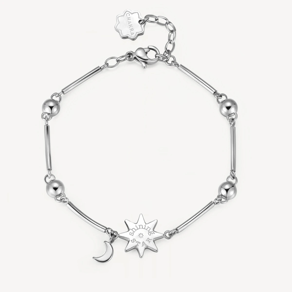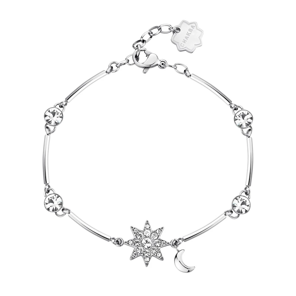 Náramek z chirurgické oceli z kolekce Chakra s ozdobou hvězdy a měsíce. Povrch náramku je leštěný. Náramek zdobí zářivé krystaly. Délka 17,5cm. Zapínání náramku je karabinové.