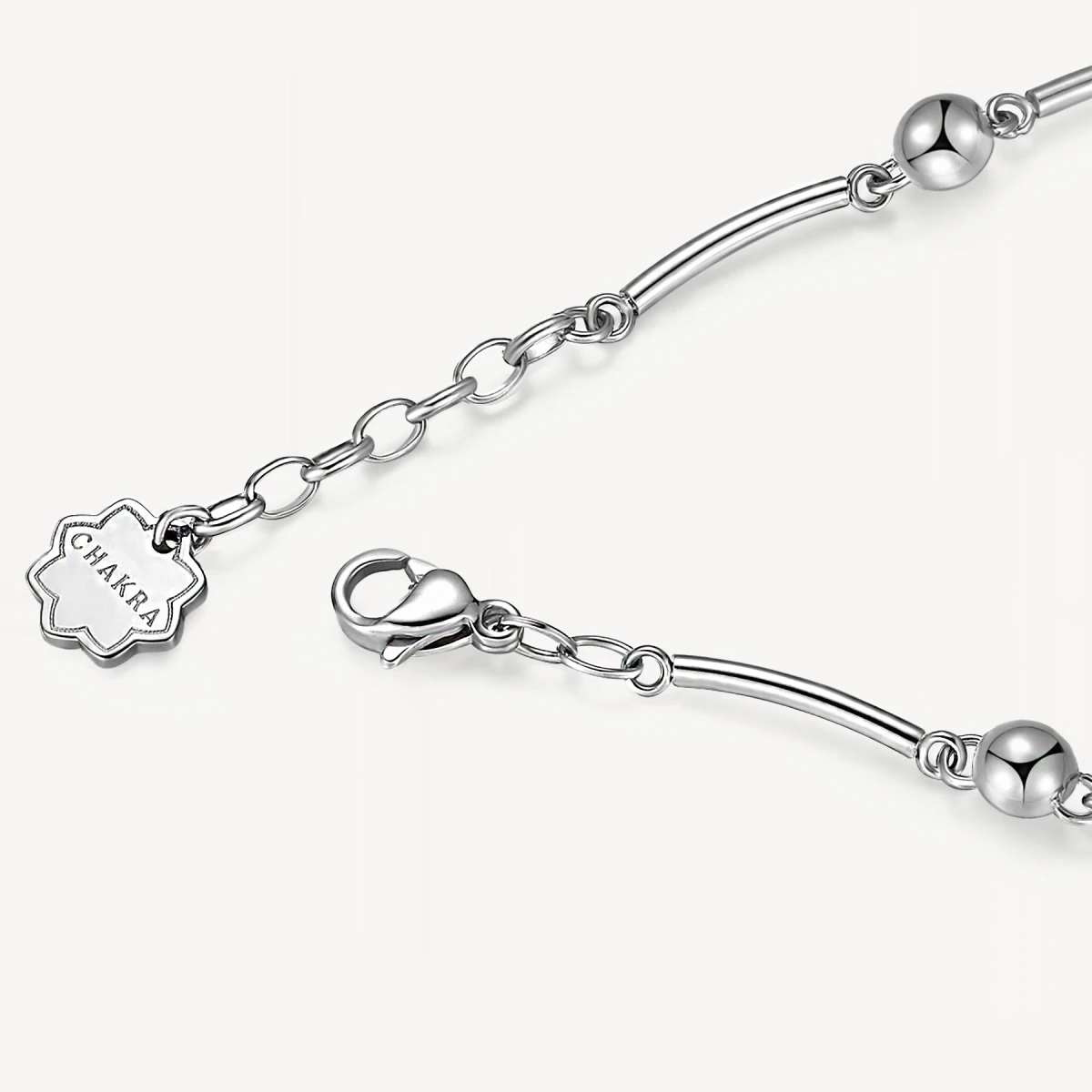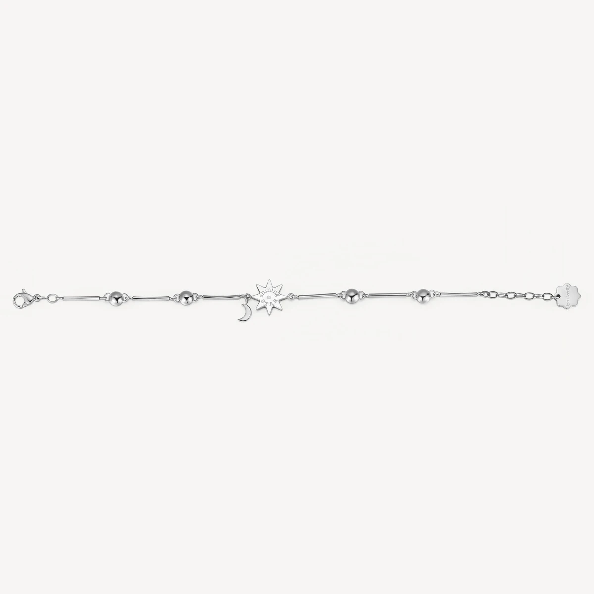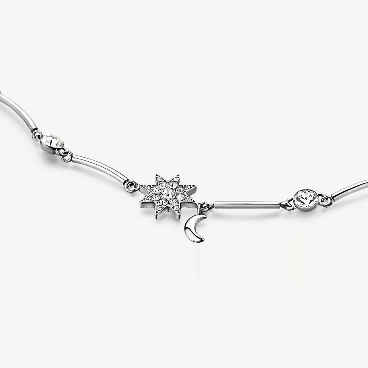 Náramek z chirurgické oceli z kolekce Chakra s ozdobou hvězdy a měsíce. Povrch náramku je leštěný. Náramek zdobí zářivé krystaly. Délka 17,5cm. Zapínání náramku je karabinové.