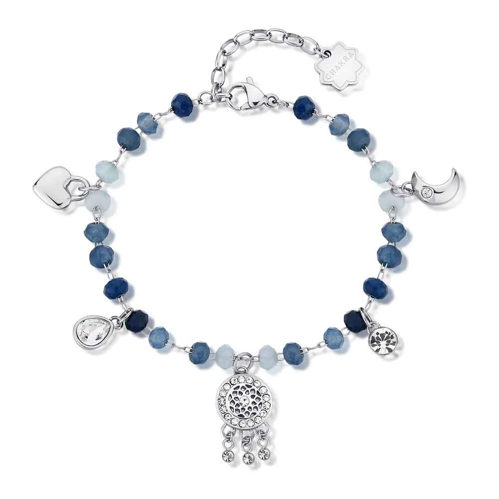 Dámský náramek na ruku s přívěsky z chirurgické oceli 316L. Povrch náramku je leštěný. Náhrdelník je ozdobený korálky z minerálu chalcedonu a zářivými krystaly. Délka náramku 18cm.