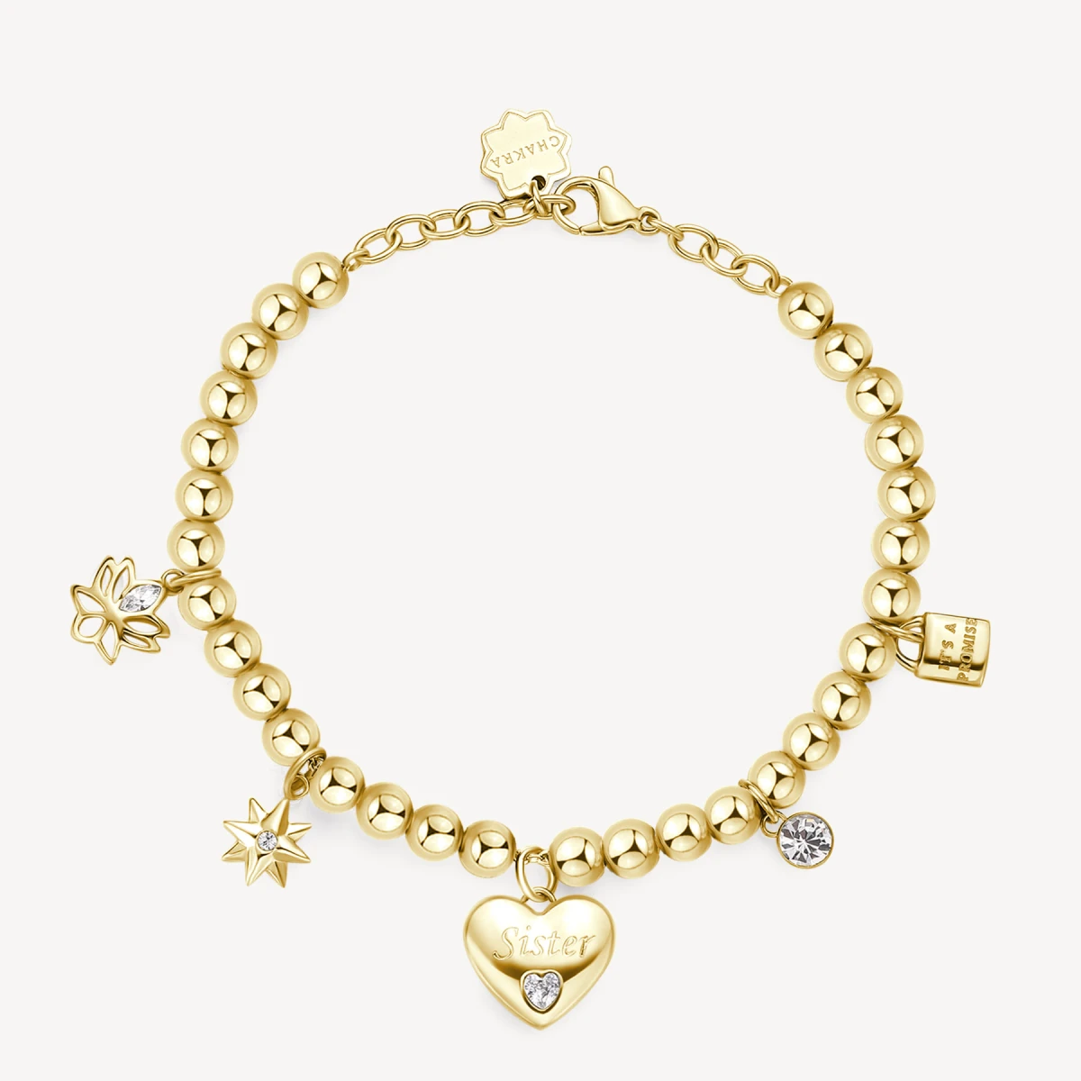Dámský náramek z chirurgické oceli z kolekce Chakra. Povrch náramku je pozlacený technologií PVD. Náramek je osazený prvotřídními zirkony. Zapínání náramku je karabinové. Délka náramku 18,5cm.