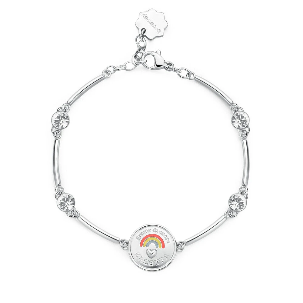 Náramek Brosway z kolekce CHAKRA zdobený přívěsky s krystaly a rytinou "Grazie di cuore maestra" je vyrobený z chirurgické oceli 316L. Šperky vyrobené z chirurgické oceli jsou odolné proti poškrábání, nemění barvu, neoxidují, nevyvolávají alergické reakce ani nereagují na pot a prach. Zapínání náramku je na karabinku. Délka náramku je 18 cm.