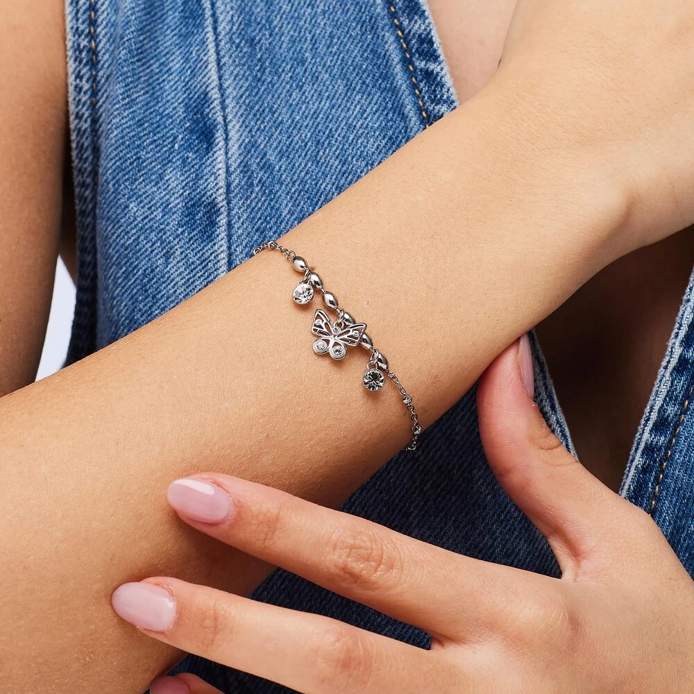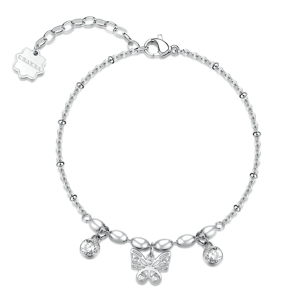Dámský náramek z chirurgické oceli s ozdobou motýlka. Náramek je osazený zářivými krystaly. Povrch náramku je leštěný. Zapínání náramku je karabinové, délka náramku 19cm.