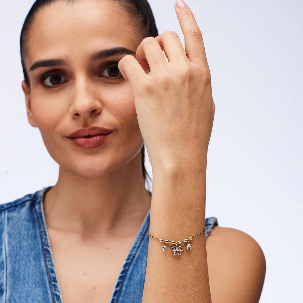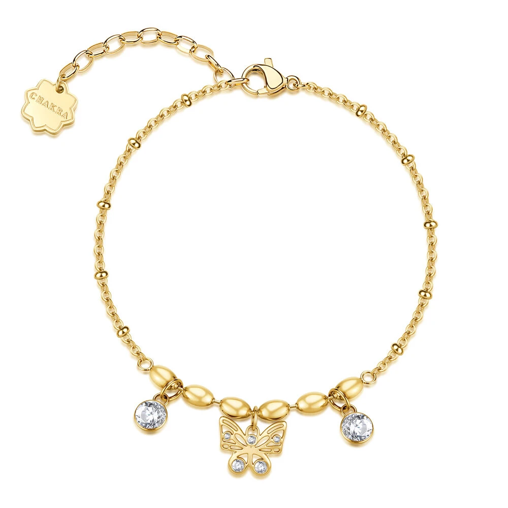 Náramek z chirurgické oceli s pozlaceným povrchem. Náramek je ozdobený přívěskem motýla osazeného zářivými krystaly. Zapínání náramku je karabinové, délka náramku 19cm.