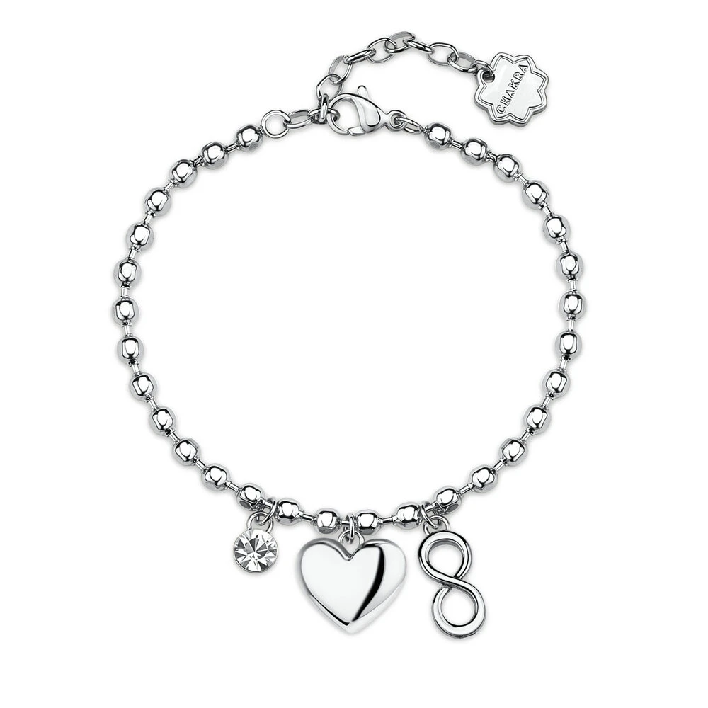 Dámský náramek z chirurgické oceli. Povrch náramku je leštěný. Náramek je ozdobený srdíčkem, symbolem nekonečna a zářivým krystalem. Zapínání náramku je karabinové, délka náramku 18 cm.