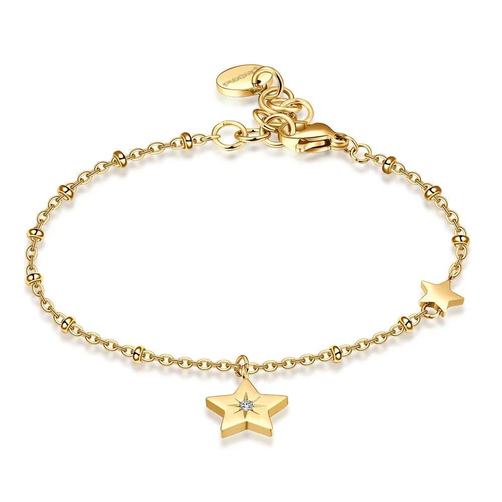 Dámský náramek z chirurgické oceli 316L s ozdobou hvězdiček. Povrch náramku je pozlacený technologií PVD. Větší hvězda je ozdobená zirkonem. Délka náramku 18,5cm.