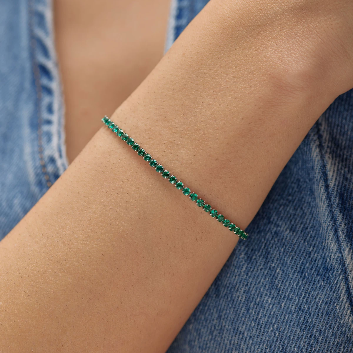 Jemný tenisový náramek z chirurgické oceli se zelenými zirkony. Zapínání náramku je na karabinku. Délka náramku 19cm.