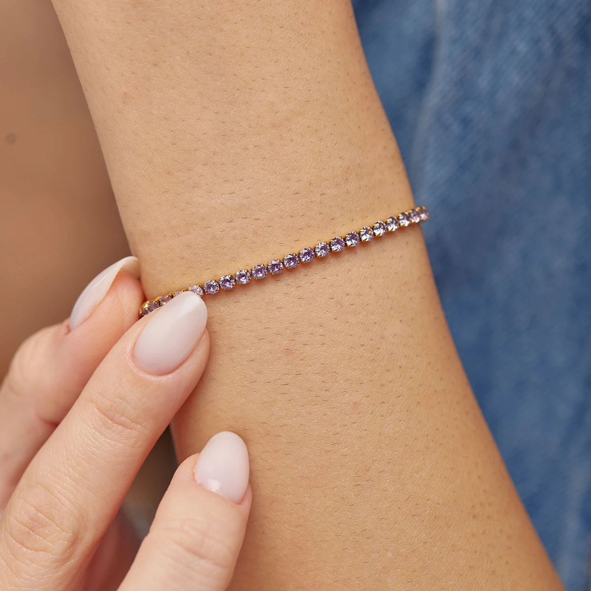 Dámský náramek z chirurgické oceli se zirkony. Povrch ocelových částí náramku je leštěný, pozlacený technologií PVD. Náramek má karabinové zapínání. Délka náramku 20 cm.