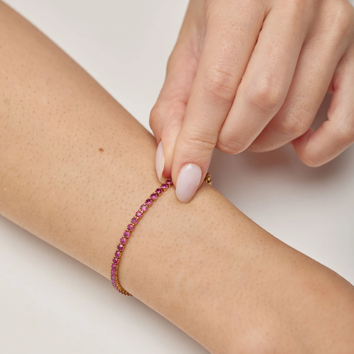 Dámský náramek z chirurgické oceli se zirkony. Povrch ocelových částí náramku je leštěný, pozlacený technologií PVD. Náramek má karabinové zapínání. Délka náramku 20 cm.