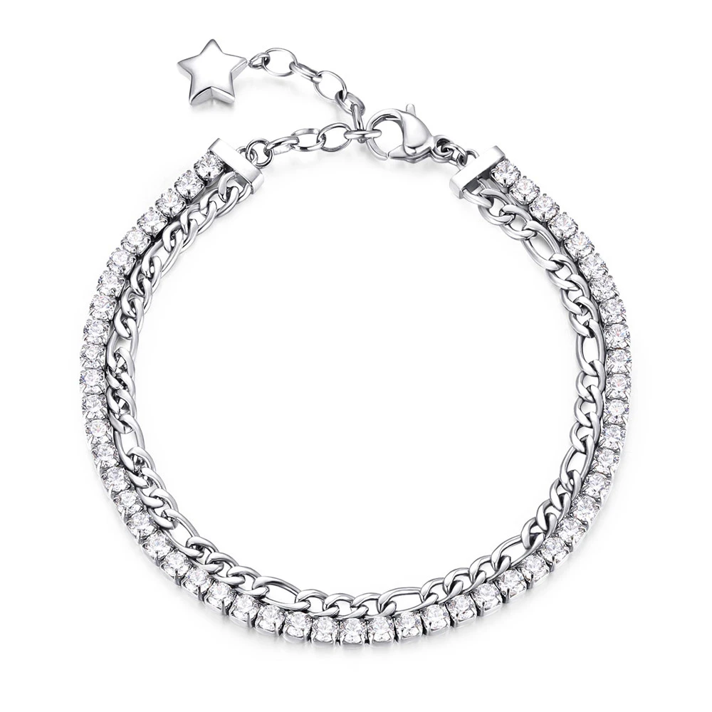 Dámský náramek z chirurgické oceli z řady Desideri. Povrch náramku je leštěný. Náramek tvoří dvě řady, jedna je osazená zářivými krystaly, druhá je řetízek. Náramek je dlouhý 18cm.