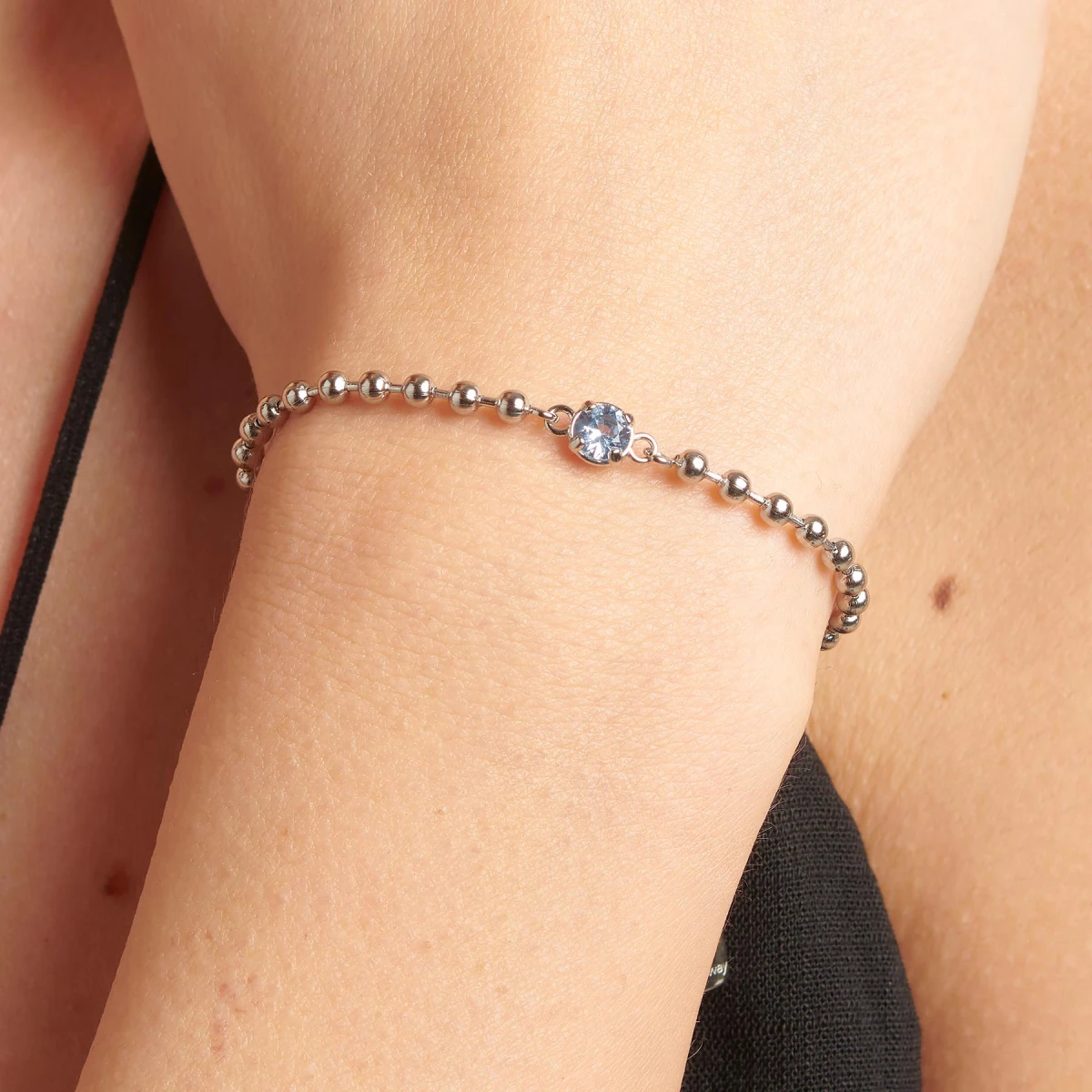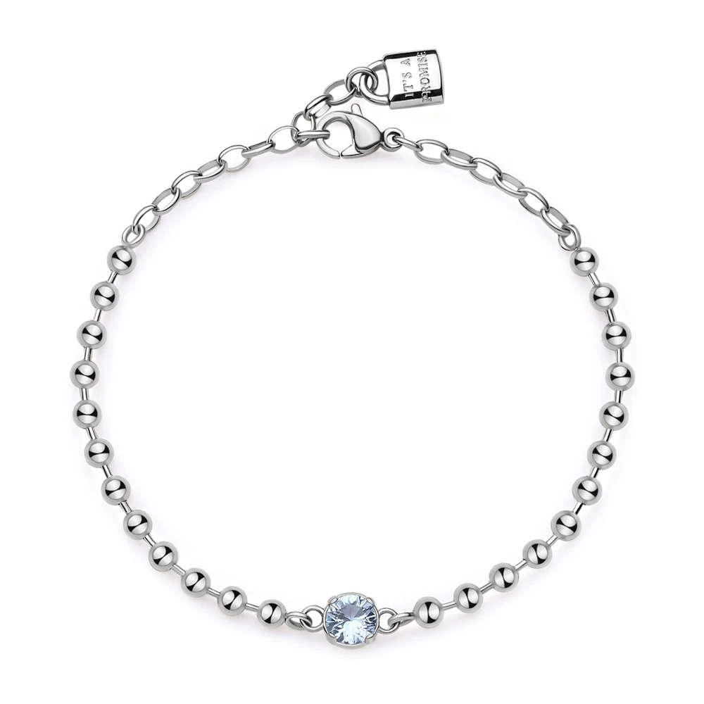Dámský náramek z chirurgické oceli zdobený světle modrým zirkonem. Náramek je dlouhý 18cm. Zapínání náramku je karabinové.