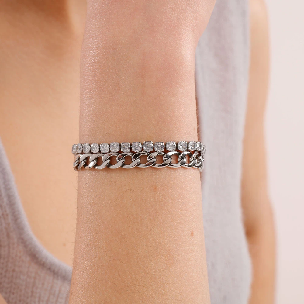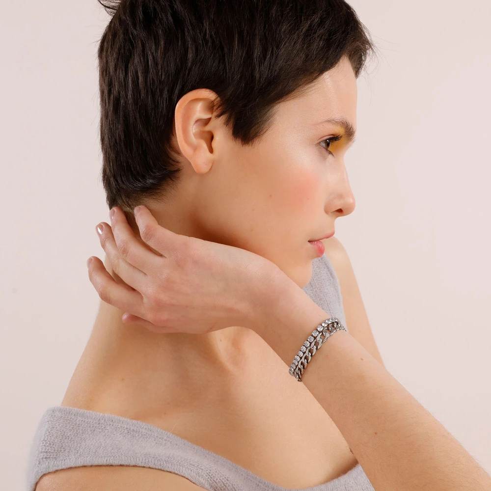 Dámský náramek z chirurgické oceli z řady Desideri. Povrch náramku je leštěný, upravený technologií PVD. Náramek tvoří dvě řady, jedna je osazená zářivými krystaly, druhá je řetízek. Náramek je dlouhý 18cm.