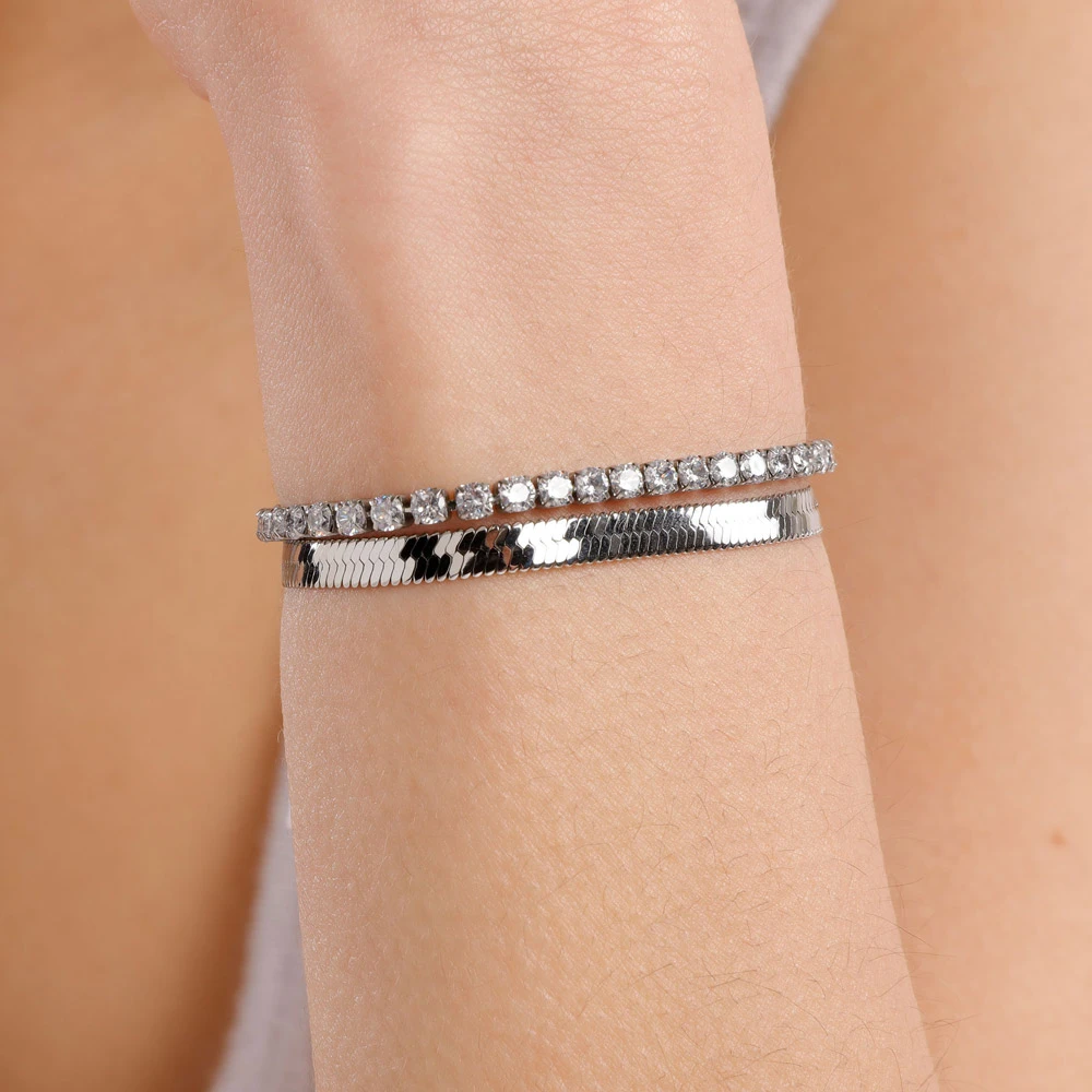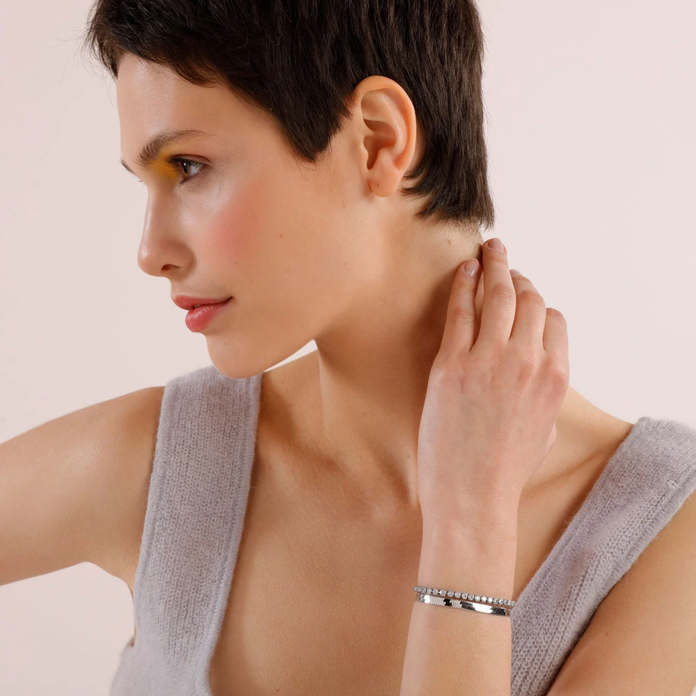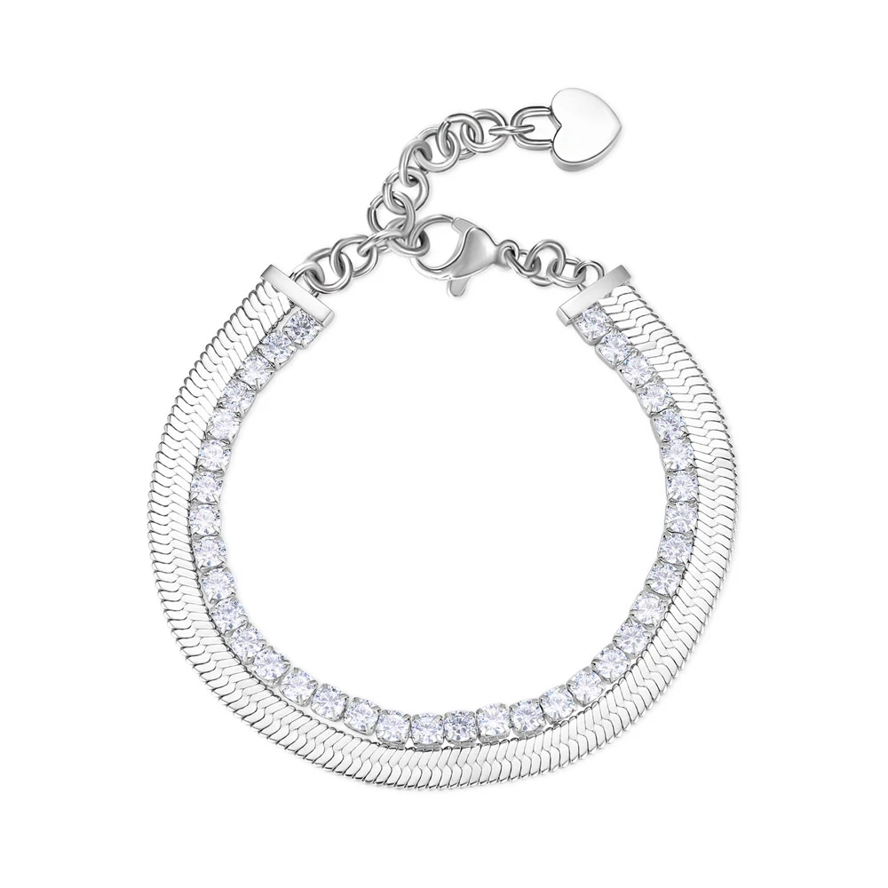 Dámský náramek z chirurgické oceli z řady Desideri. Povrch náramku je leštěný. Náramek tvoří dvě řady, jedna je osazená zářivými zirkony, druhá je plochý řetízek vzor hádě. Délka náramku 18cm.