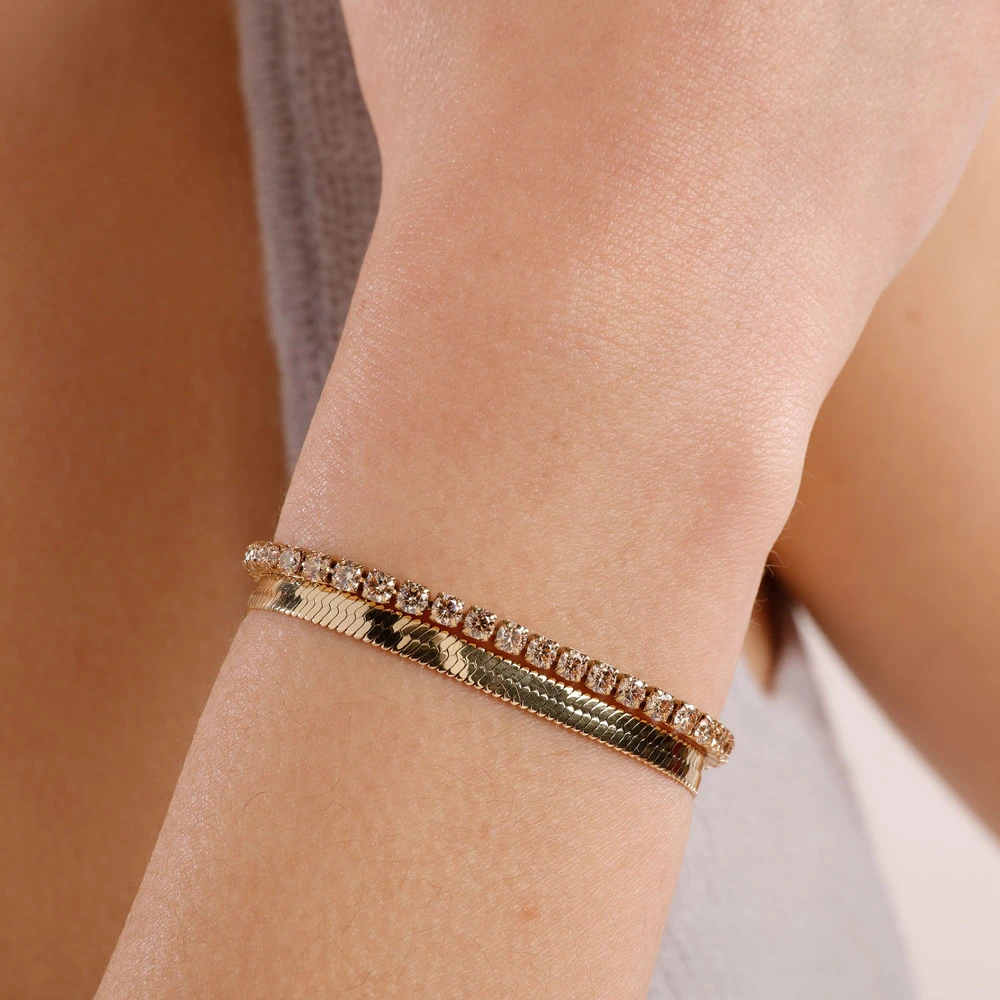 Dámský náramek z chirurgické oceli z řady Desideri. Povrch náramku je pozlacený technologií PVD. Náramek tvoří dvě řady, jedna je osazená zářivými zirkony, druhá je plochý řetízek vzor hádě. Náramek je dlouhý 18cm.