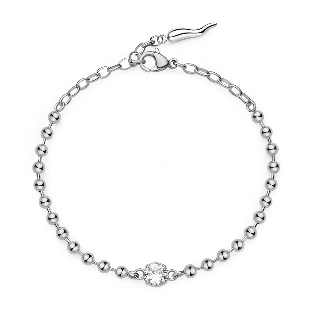 Dámský náramek z chirurgické oceli zdobený čirým zirkonem. Povrch náramku je leštěný. Náramek je dlouhý 18cm, zapínání náramku je karabinové.