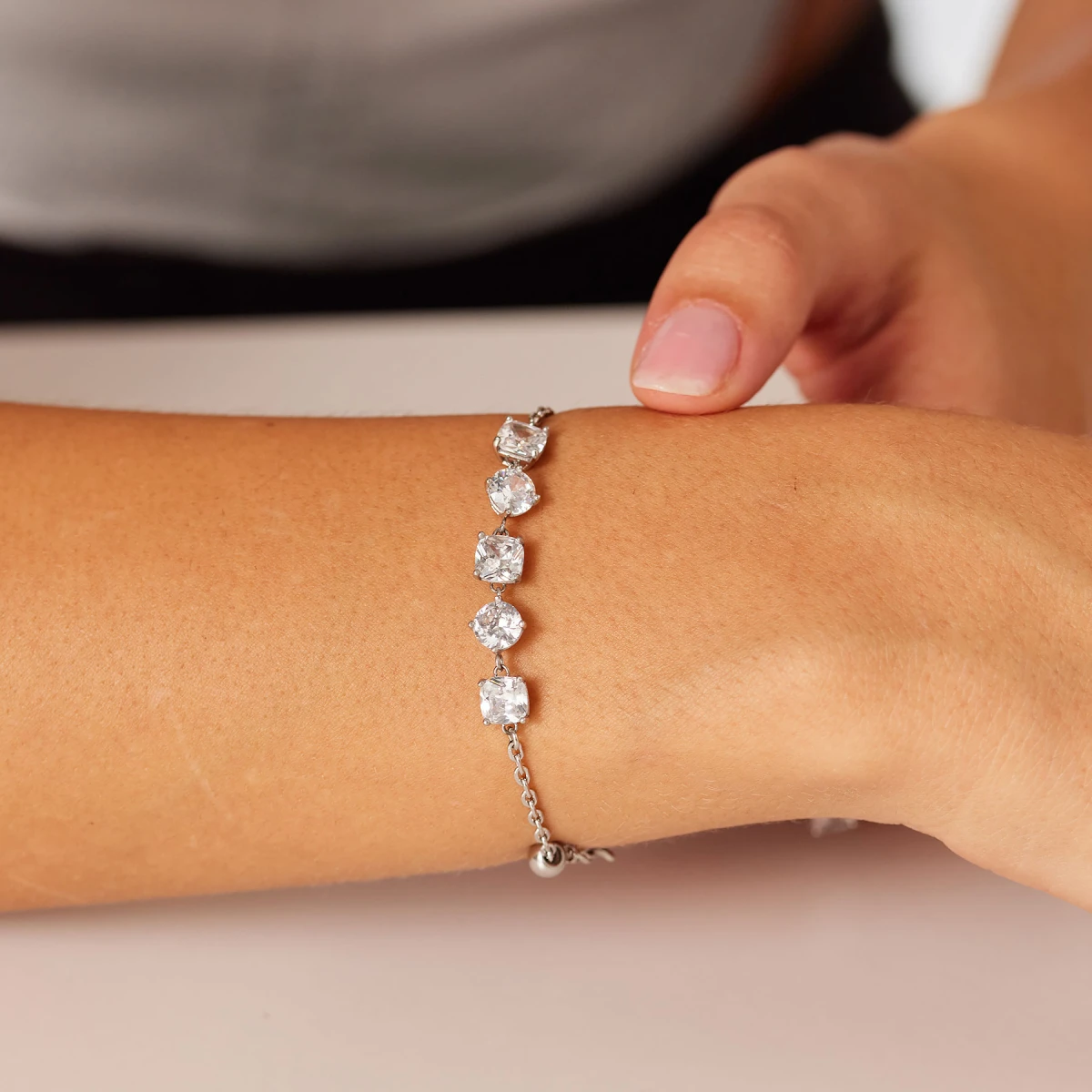 Dámský náramek z chirurgické oceli se zirkony. Povrch ocelových částí náramku je leštěný, zirkony jsou čiré. Náramek má karabinové zapínání. Délka náramku 19 cm.