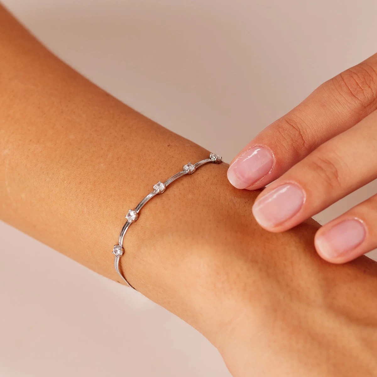 Dámský náramek z chirurgické oceli. Povrch náramku je leštěný. Náramek je ozdobený zářivými zirkony. Zapínání náramku je karabinové, délka náramku 19 cm.