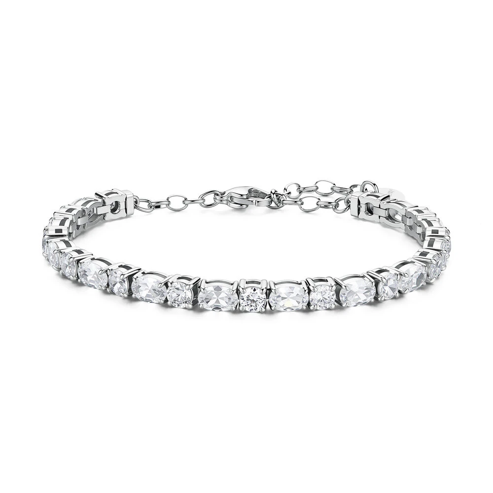 Tenisový náramek z chirurgické oceli zdobený prvotřídními zirkony. Povrch ocelových částí náramku je leštěný. Zapínání náramku je karabinové. Délka náramku 19 cm.