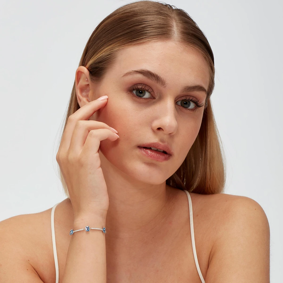 Stříbrný náramek osazený prvotřídními zirkony. Náramek je vyrobený ze stříbra ryzosti 925/1000 s porhodiovaným povrchem. Úprava povrchu náramku rhodiováním zvyšuje jeho odolnost a zajišťuje dlouhodobý bezchybný vzhled šperku. Zapínání náramku je karabinové. Délka náramku 16cm.