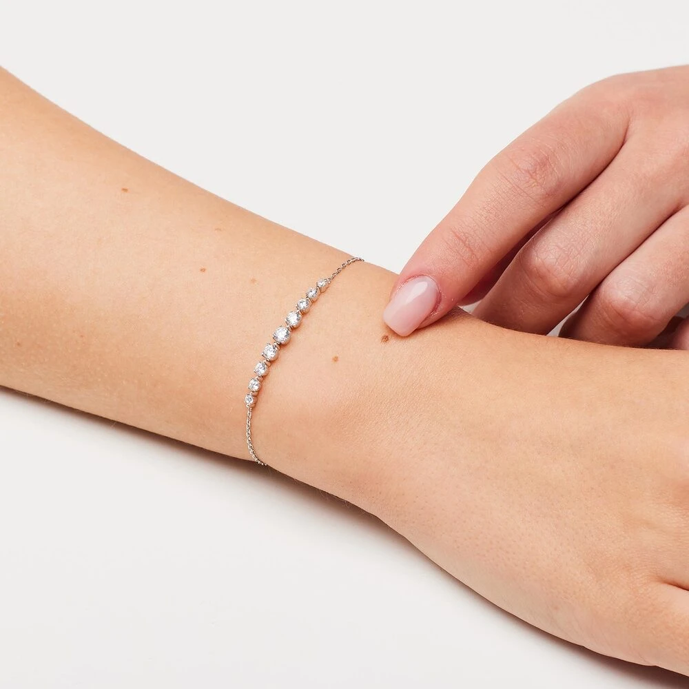 Stříbrný náramek se zirkony je dokonalým doplňkem pro každou ženu. Náramek je vyrobený z kvalitního stříbra 925/1000 a je osazený oslnivými zirkony, které dodávají náramku nádech luxusu. Stříbrný náramek se zirkony je ideální volbou pro každou příležitost – ať už se chystáte na večerní akci, romantickou večeři nebo chcete vypadat skvěle i v běžném dni. Díky úpravě rhodiováním si udrží svůj vzhled po dlouhou dobu. Stříbrný náramek s kamínky může být výjimečným dárkem, který spojí krásu a styl. Neváhejte a pořiďte tento krásný stříbrný náramek pro sebe, nebo pro Vaše blízké.