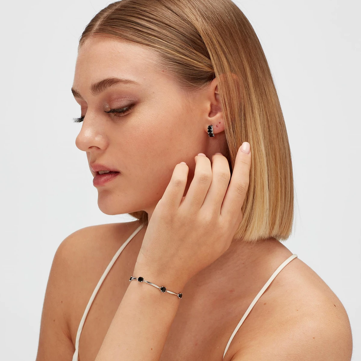 Stříbrný náramek osazený prvotřídními zirkony. Náramek je vyrobený ze stříbra ryzosti 925/1000 s porhodiovaným povrchem. Úprava povrchu náramku rhodiováním zvyšuje jeho odolnost a zajišťuje jeho dlouhodobý bezchybný vzhled. Zapínání náramku je karabinové. Délka náramku 16cm.