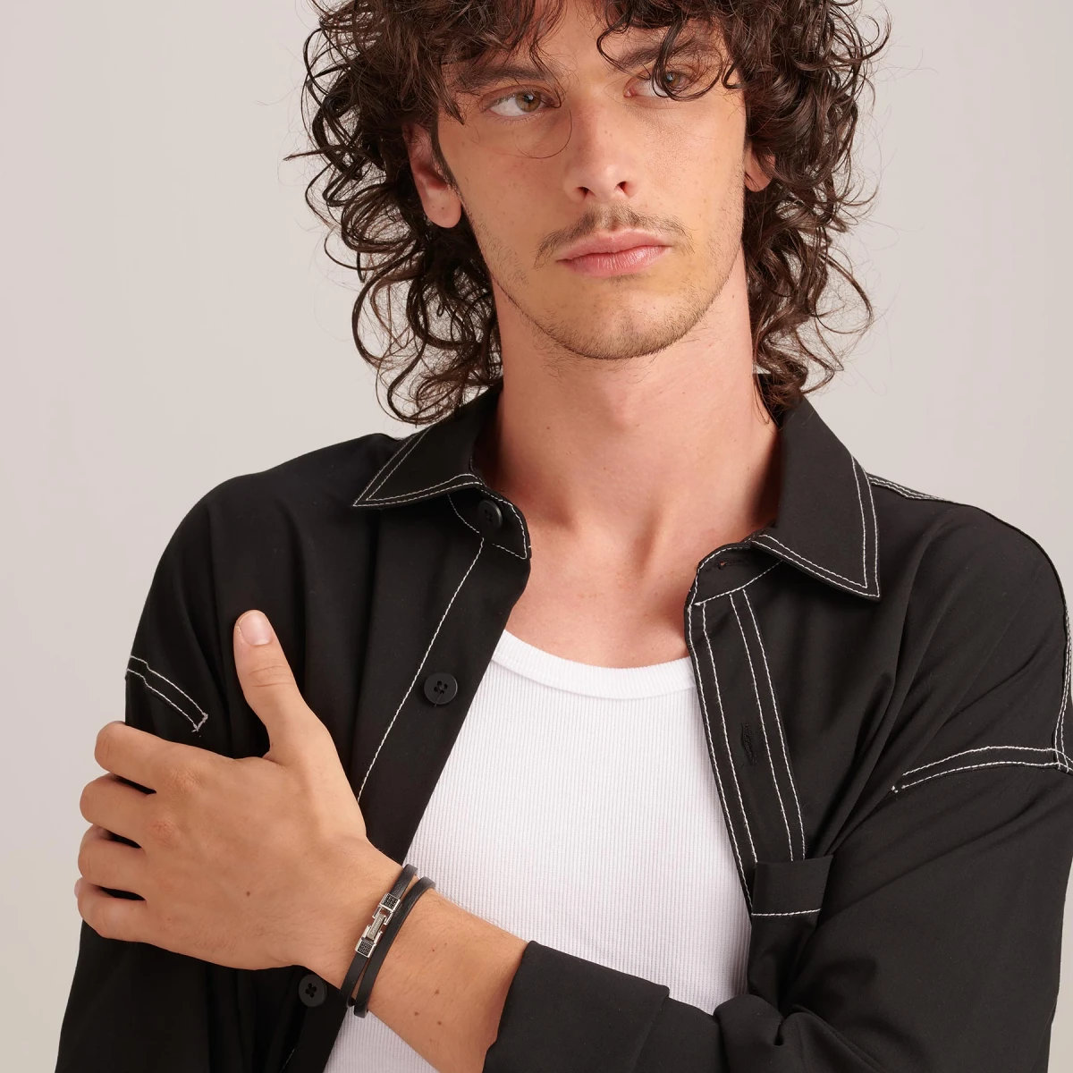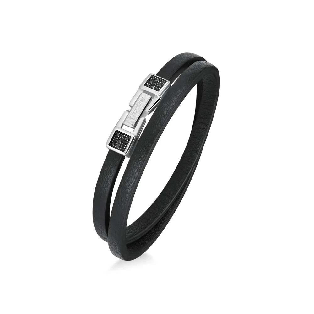 Náramek na ruku pro muže. Náramek je kombinace chirurgické oceli a kůže. Zdobné zapínání má leštěný povrch a je ozdobený černými zirkony.