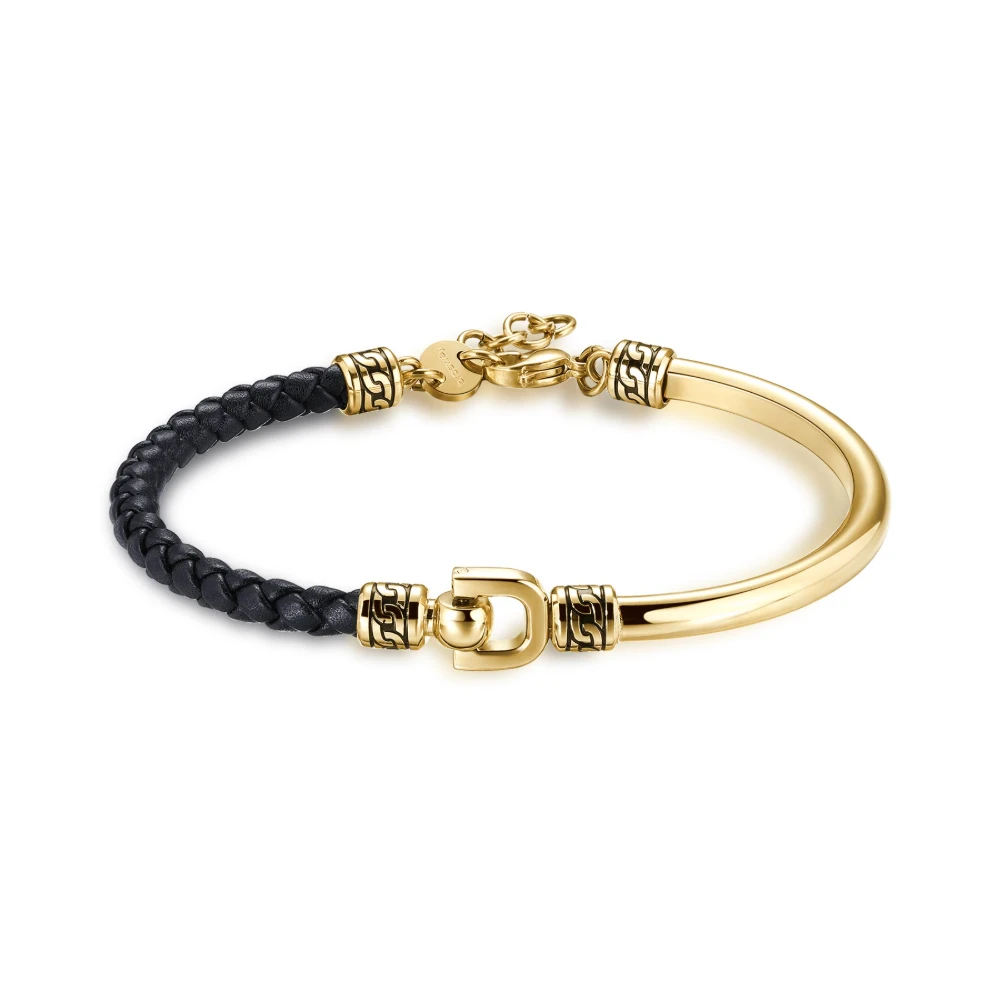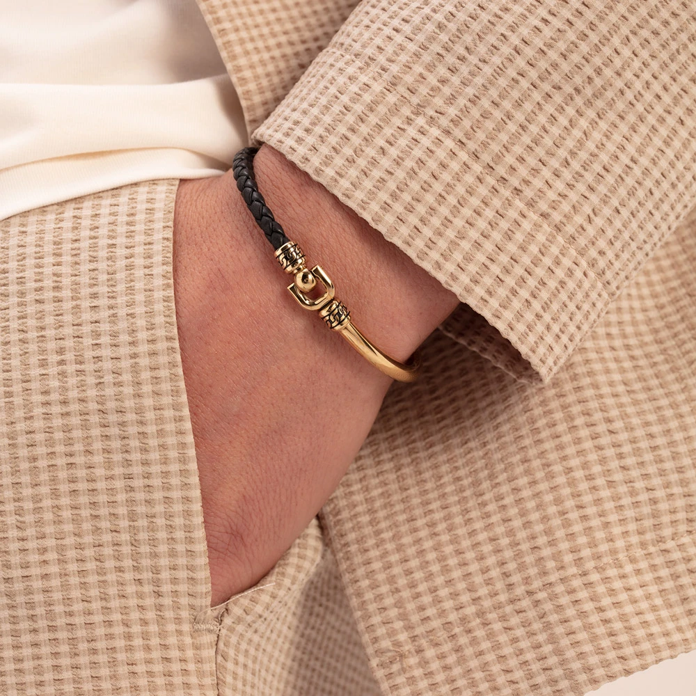 Pánský náramek z chirurgické oceli 316l a kůže. Povrch ocelové části náramku je pozlacený technologií PVD. Průměr náramku 70mm.