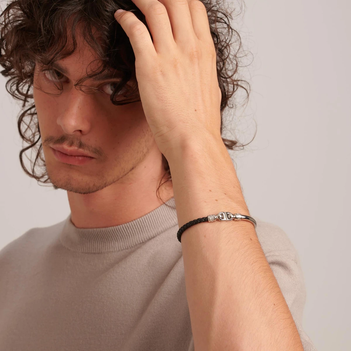 Pánský náramek na ruku z chirurgické oceli a umělé kůže. Ocelové části náramku mají leštěný povrch. Náramkové zapínání je na klip.