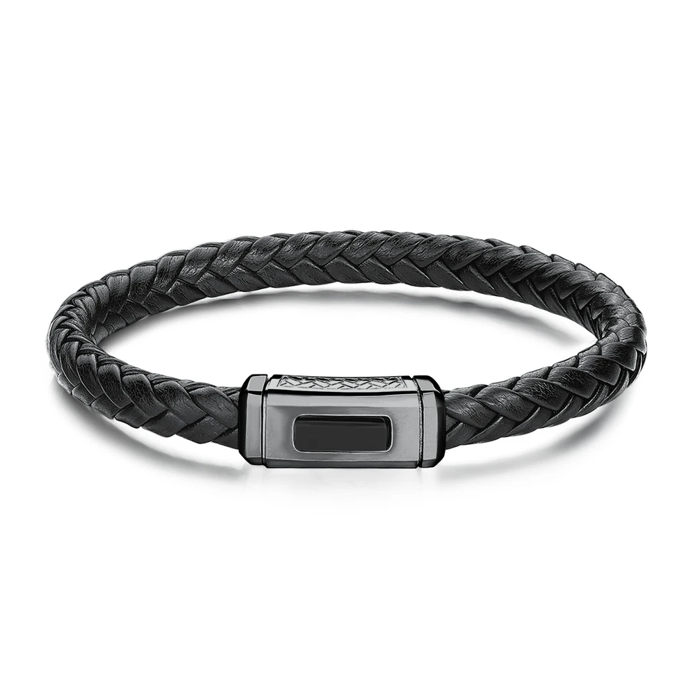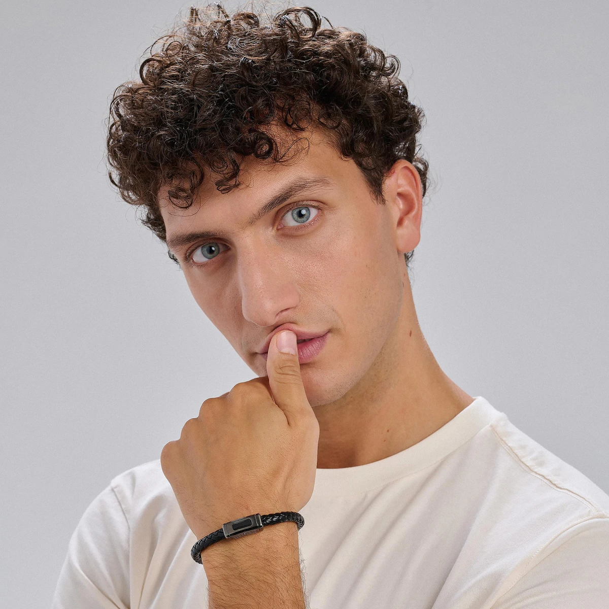 Pánský náramek z kůže a chirurgické oceli. Zdobené zapínání z chirurgické oceli má černou PVD barvu. Kůže je také černá. Náramek je dlouhý 21cm.