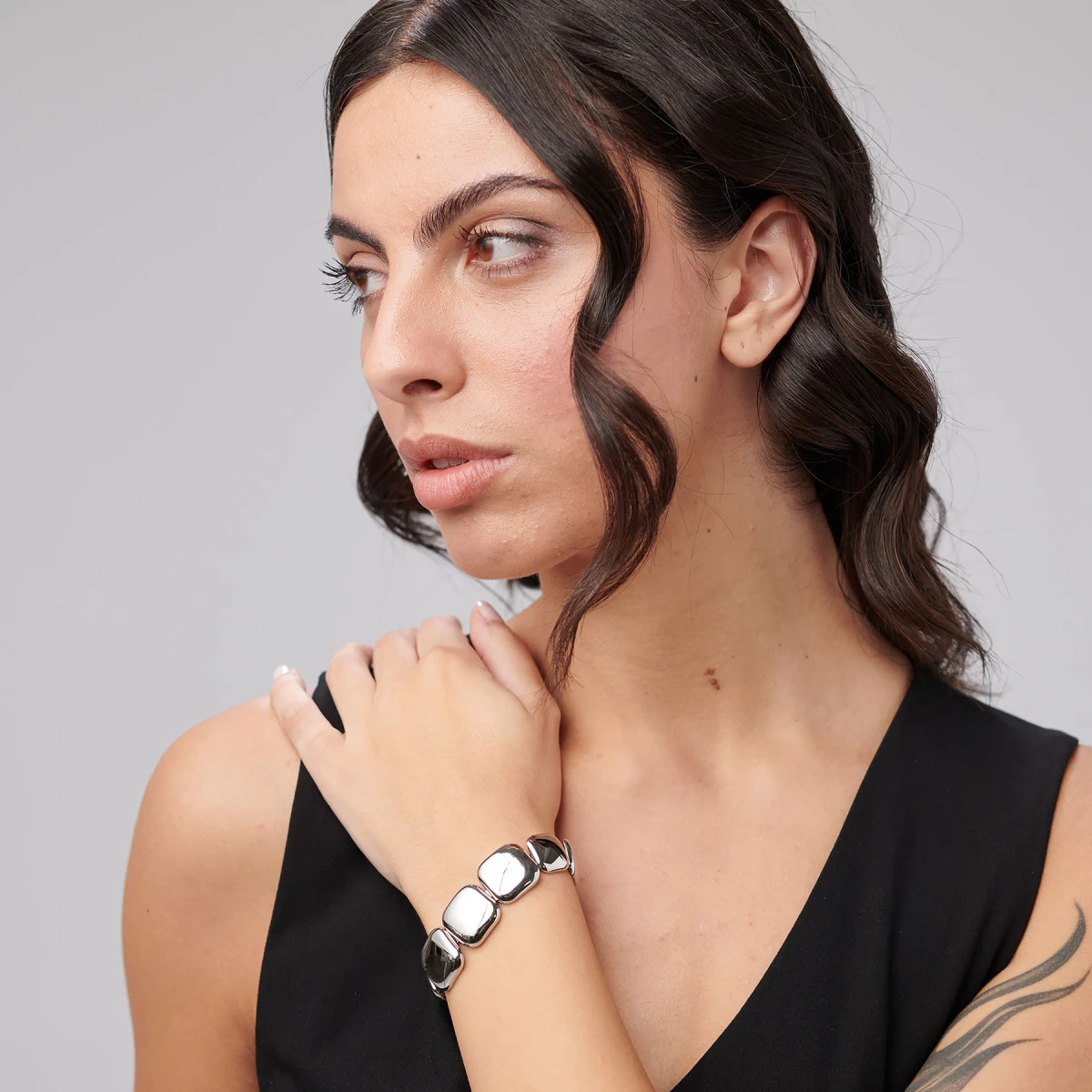 Náramek na ruku pro ženy a dívky vyrobený z chirurgické oceli. Náramek má hladký leštěný povrch. Zapínání náramku je karabinové. Náramek je dlouhý 19 cm.