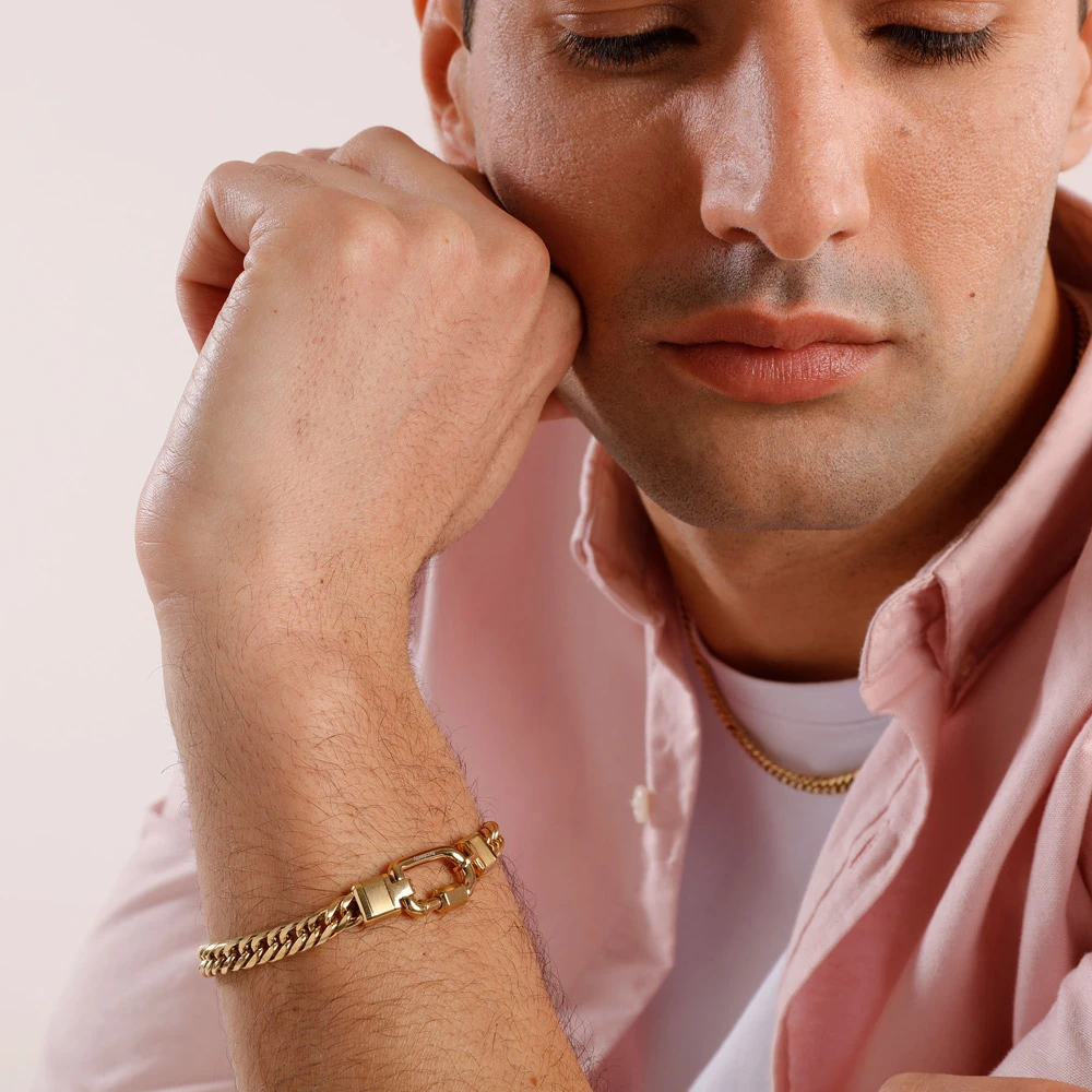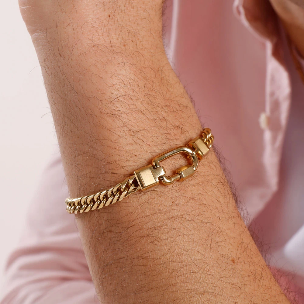 Pánský náramek z chirurgické oceli 316L. Povrch náramku je pozlacený technologií PVD. Náramek má zdobné zapínání, délka 22cm.