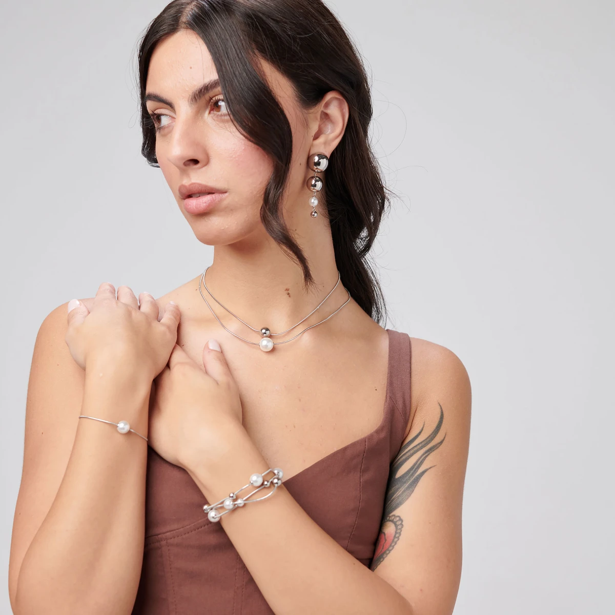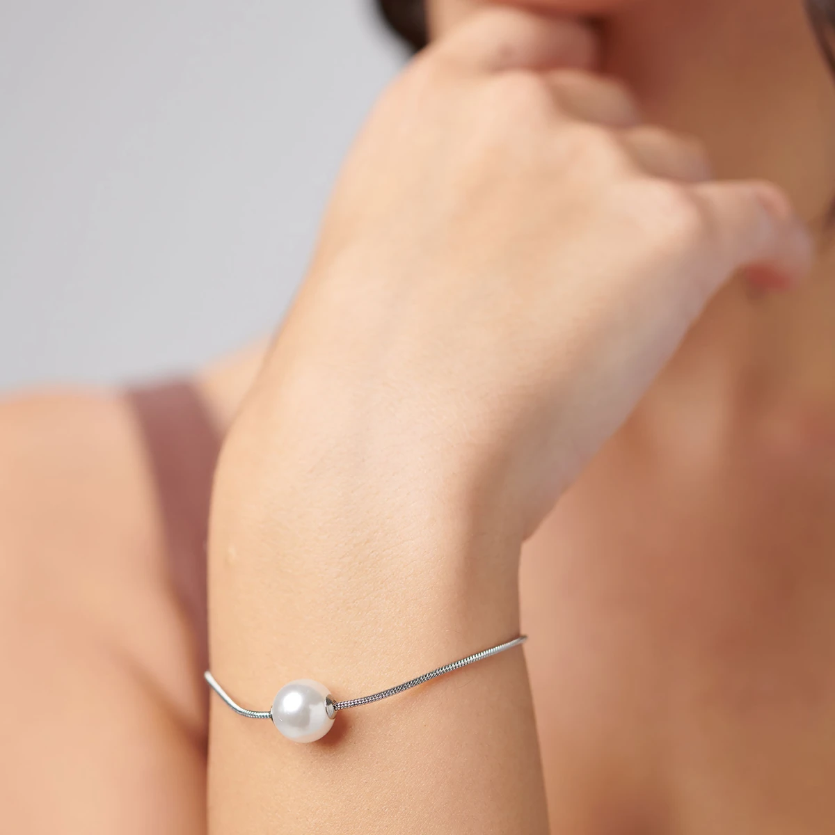 Dámský náramek z chirurgické oceli zdobený umělou perličkou. Povrch náramku je leštěný. Náramek je dlouhý 19cm. Zapínání náramku je karabinové.