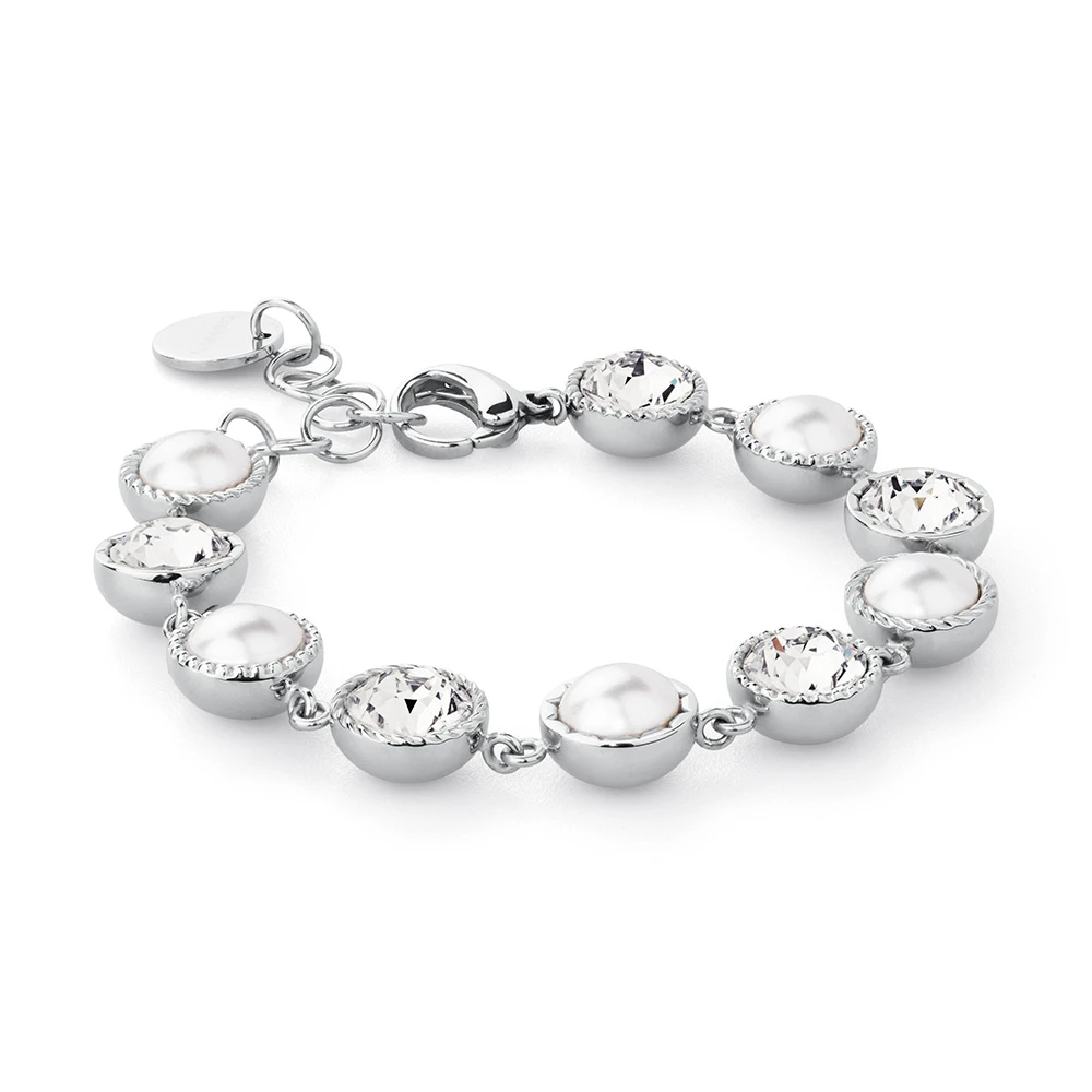 Elegantní náramek Brosway z kolekce Riflessi zdobený krystaly v bílé barvě a perlami je vyrobený z chirurgické oceli 316L. Šperky vyrobené z chirurgické oceli jsou odolné proti poškrábání, nemění barvu, neoxidují, nevyvolávají alergické reakce ani nereagují na pot a prach. Zapínání náramku je na karabinku. Délka náramku je 20 cm.