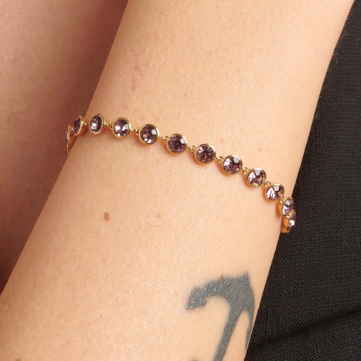 Dámský náramek z chirurgické oceli zdobený krystaly. Povrch náramku je leštěný pozlacený technologií PVD. Náramek je dlouhý 18cm, zapínání náramku je karabinové.