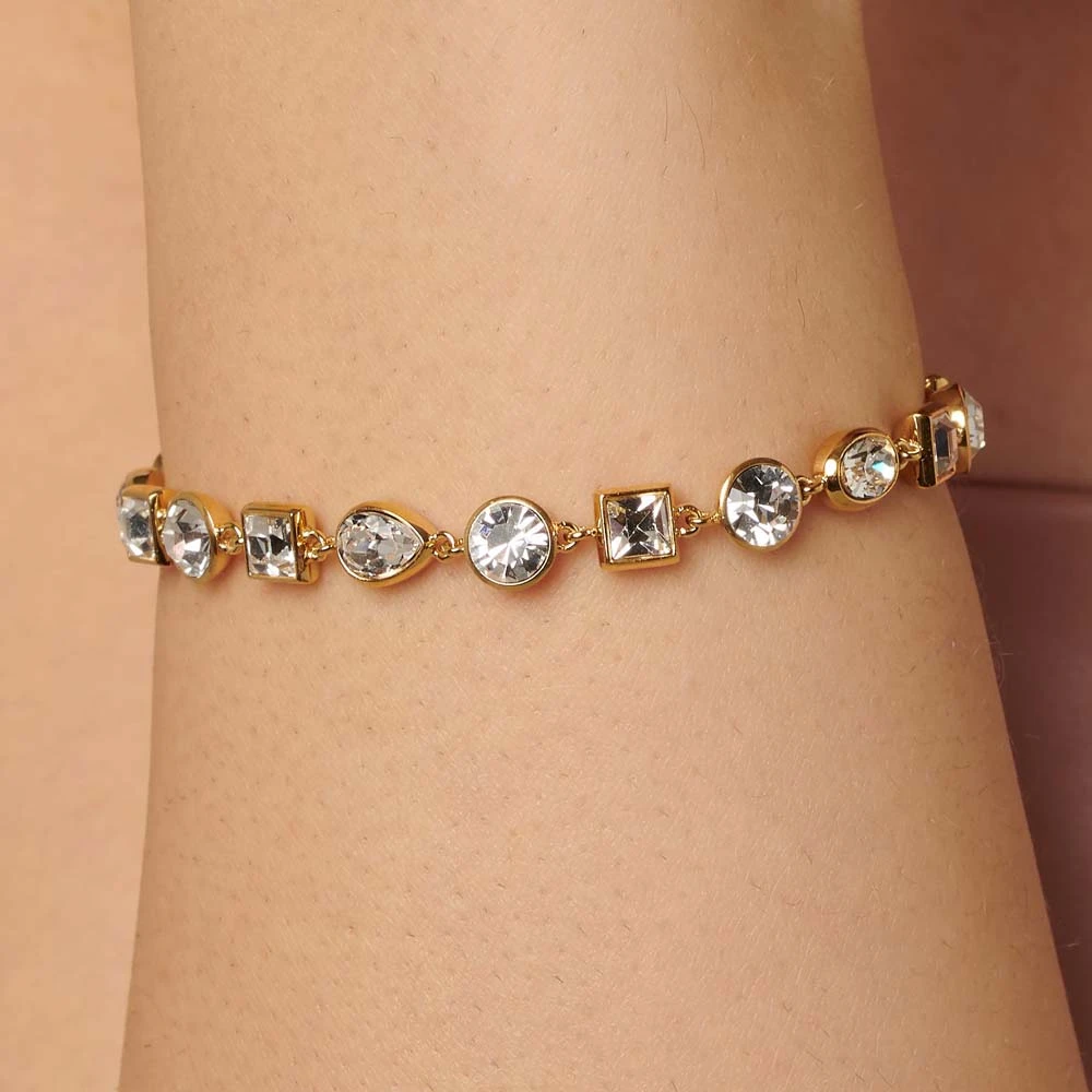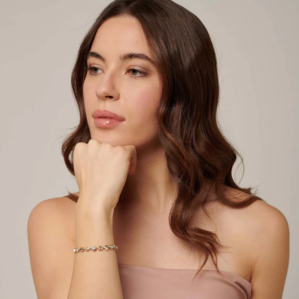 Dámský náramek z chirurgické oceli. Povrch náramku je pozlacený technologií PVD. Náramek je ozdobený zářivými krystaly. Zapínání náramku je karabinové, délka náramku 19cm.