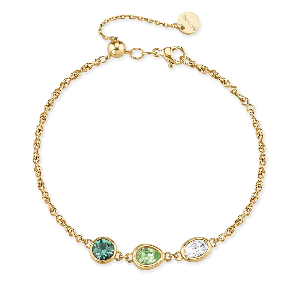 Dámský náramek z chirurgické oceli. Povrch náramku je pozlacený technologií PVD. Náramek je ozdobený zářivými krystaly. Zapínání náramku je karabinové, délka náramku 19,5 cm.