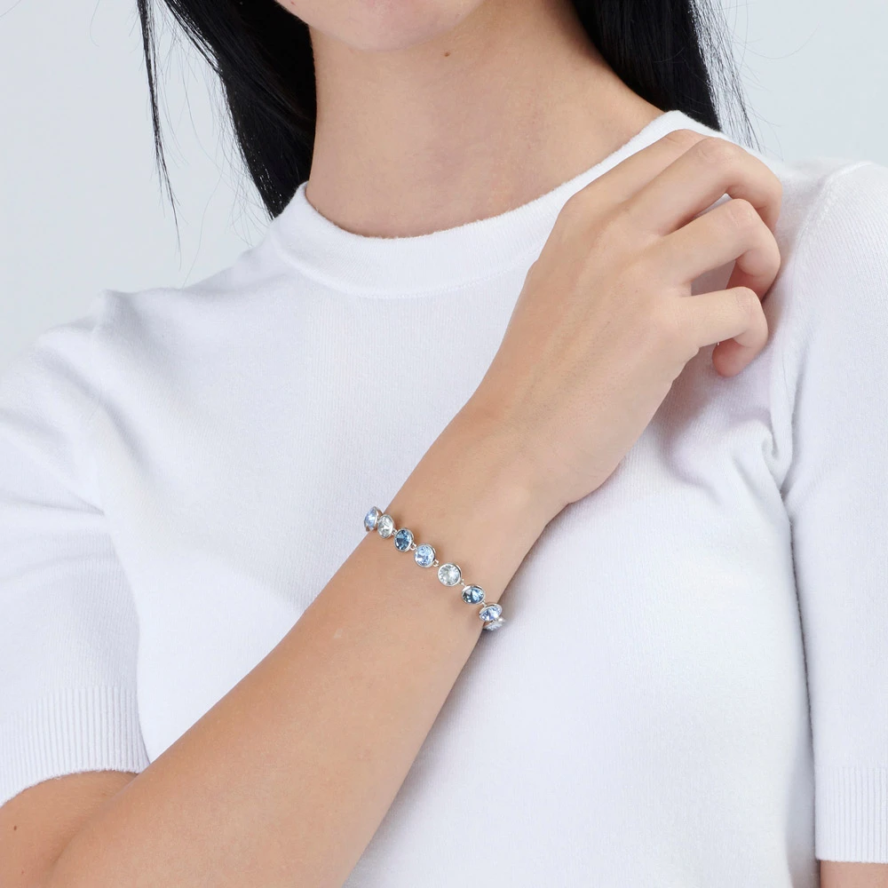 Dámský náramek z chirurgické oceli 316L. Krásný náramek ozdobený modrými a bílými krystaly. Náramek je dlouhý 19cm.