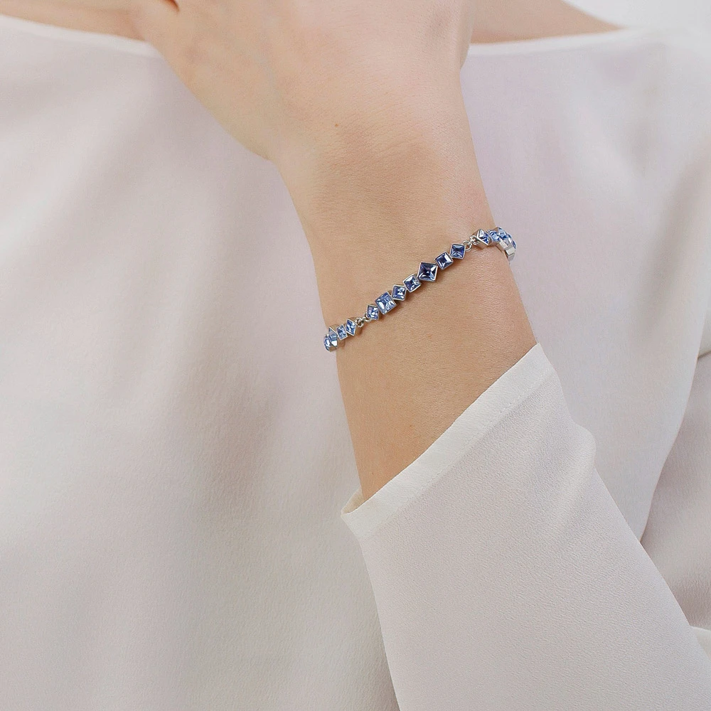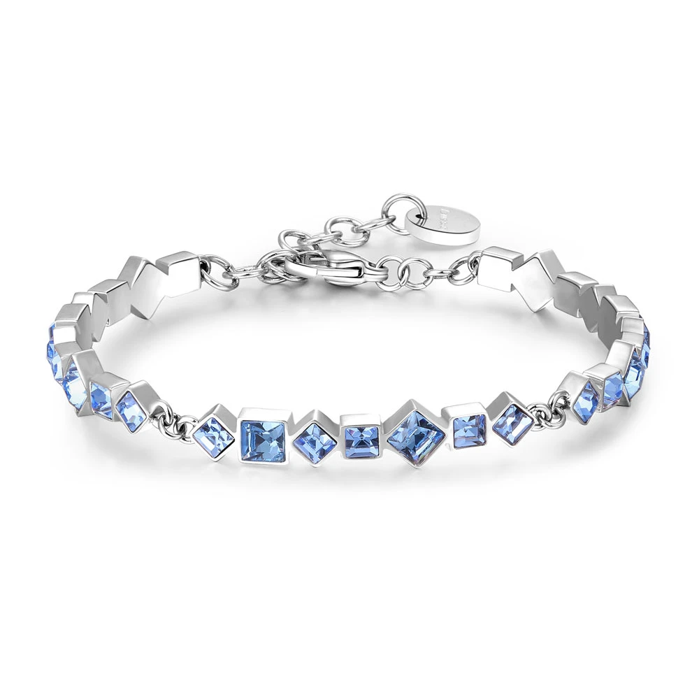 Dámský náramek vyrobený z chirurgické oceli 316L patří do kolekce Symphonia. Povrch náramku je leštěný, upravený technologií PVD a zdobený modrými krystaly. Průměr náramku je 65mm