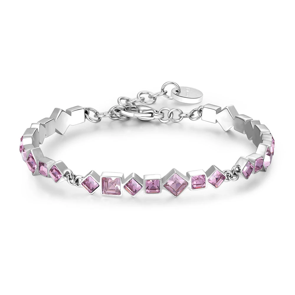 Dámský náramek vyrobený z chirurgické oceli 316L patří do kolekce Symphonia. Povrch náramku je leštěný, upravený technologií PVD a zdobený růžovými krystaly. Průměr náramku je 65mm